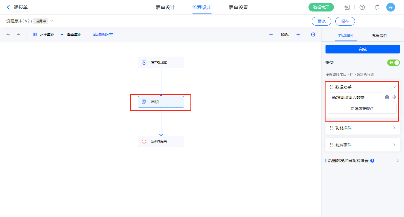 5)该表单是流程表单,设置流程节点审核,该节点属性的节点权限提交设置一条数据助手,名称为新增调出调入数据;