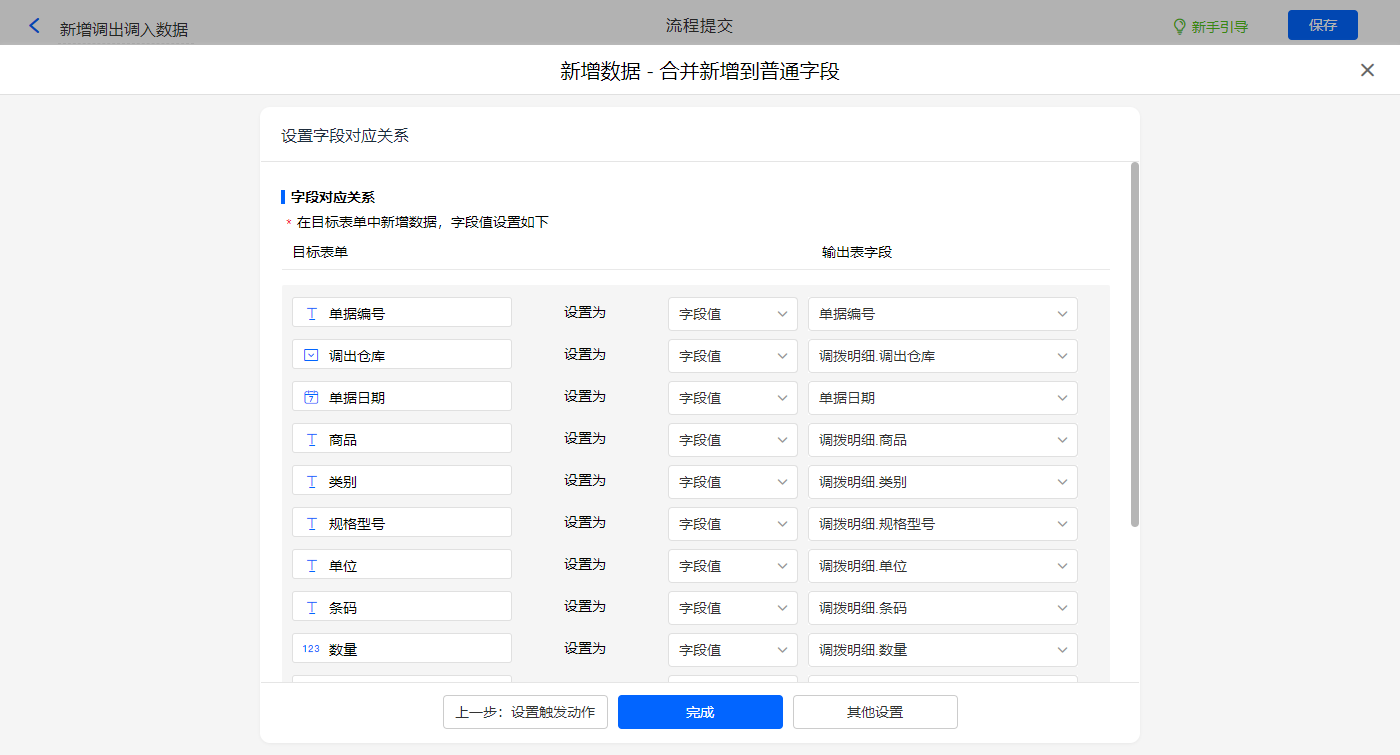 添加新增数据的执行动作,选择目标表单【调拨单_调出】,选择对应字段,设置好点击【完成】并保存该数据助手;