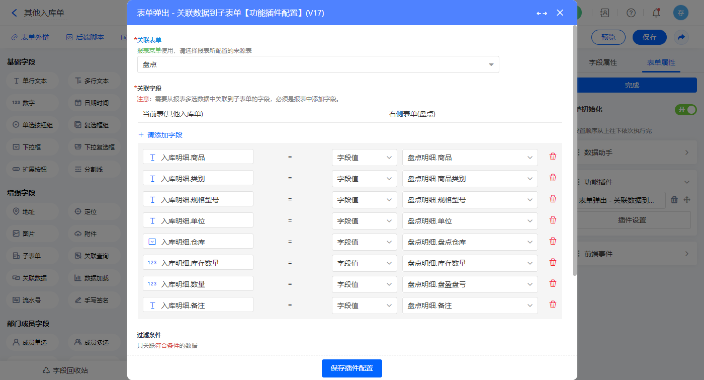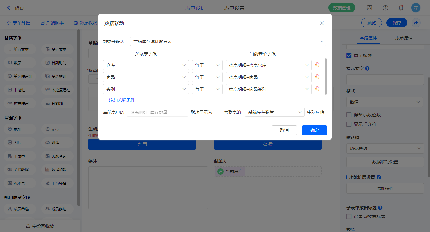 1)【盘点明细.库存数量】字段,默认值选择数据联动,设置联动条件及对应字段;