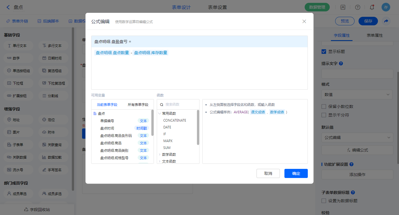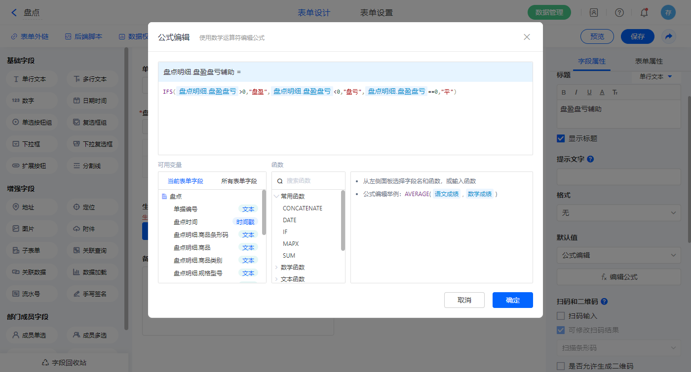 选择【盘点明细.盘盈盘亏】字段,设置默认值为公式编辑,如图设置公式;