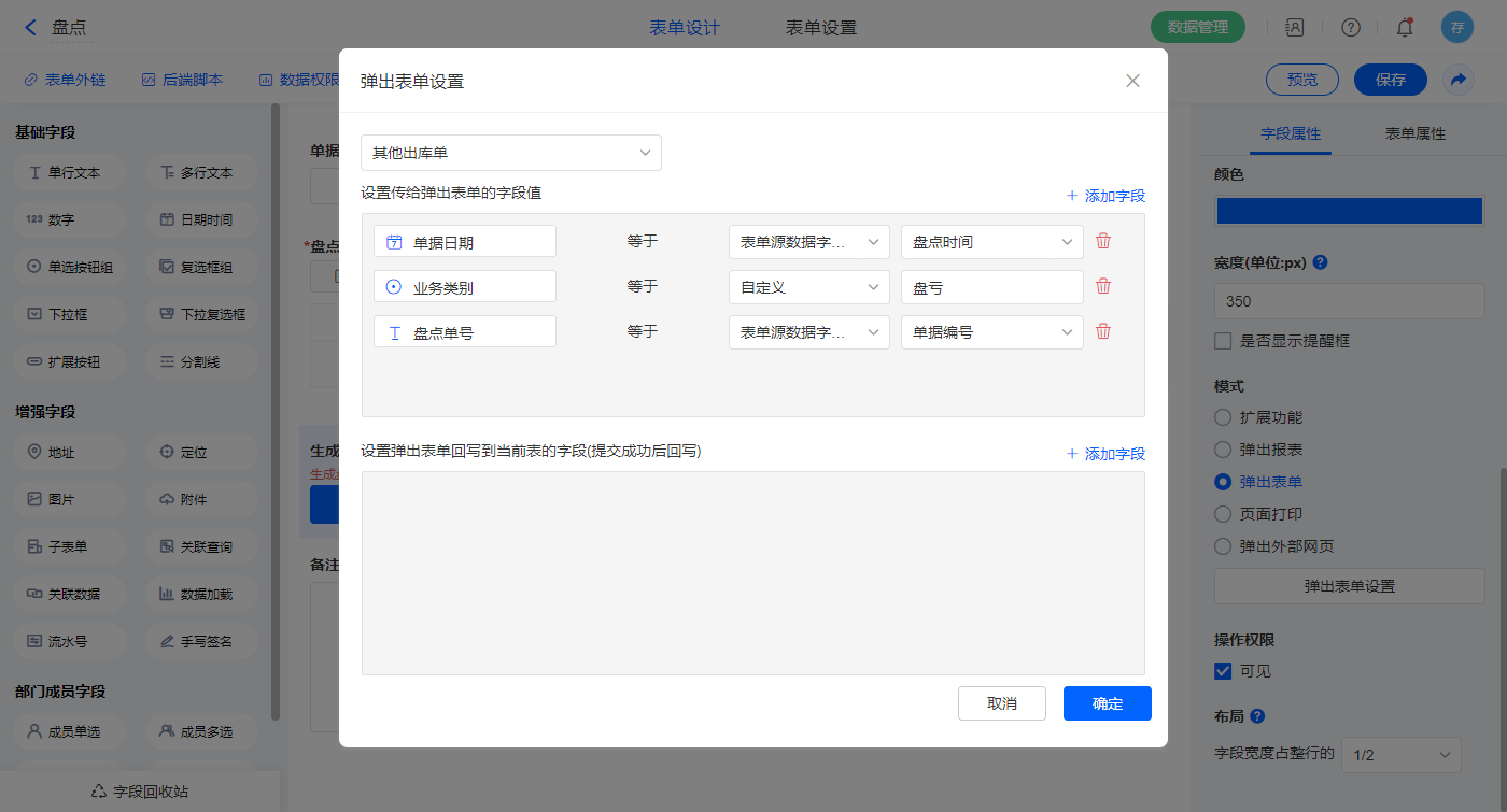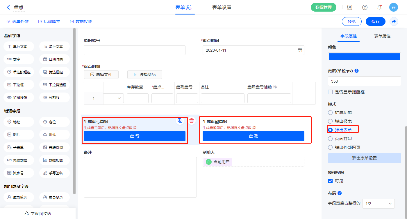 2)【生成盘亏单据】、【生成盘盈单据】两个字段设置模式为弹出表单;