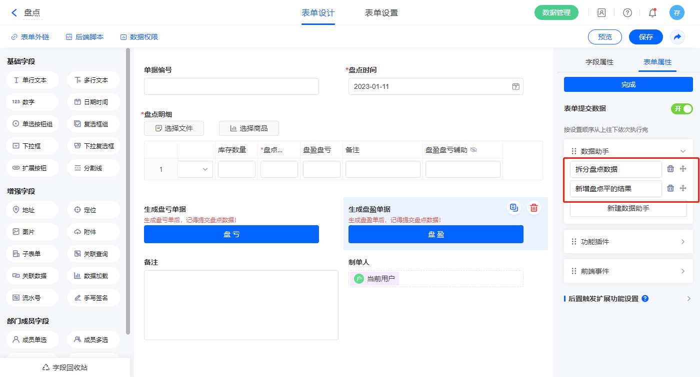 3)表单提交数据新增两条数据助手,名称分为拆分盘点数据、新增盘点平的结果;