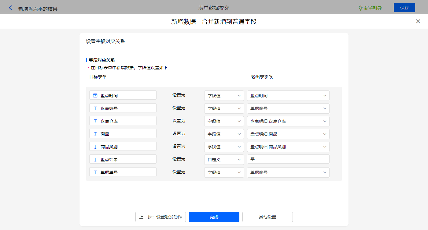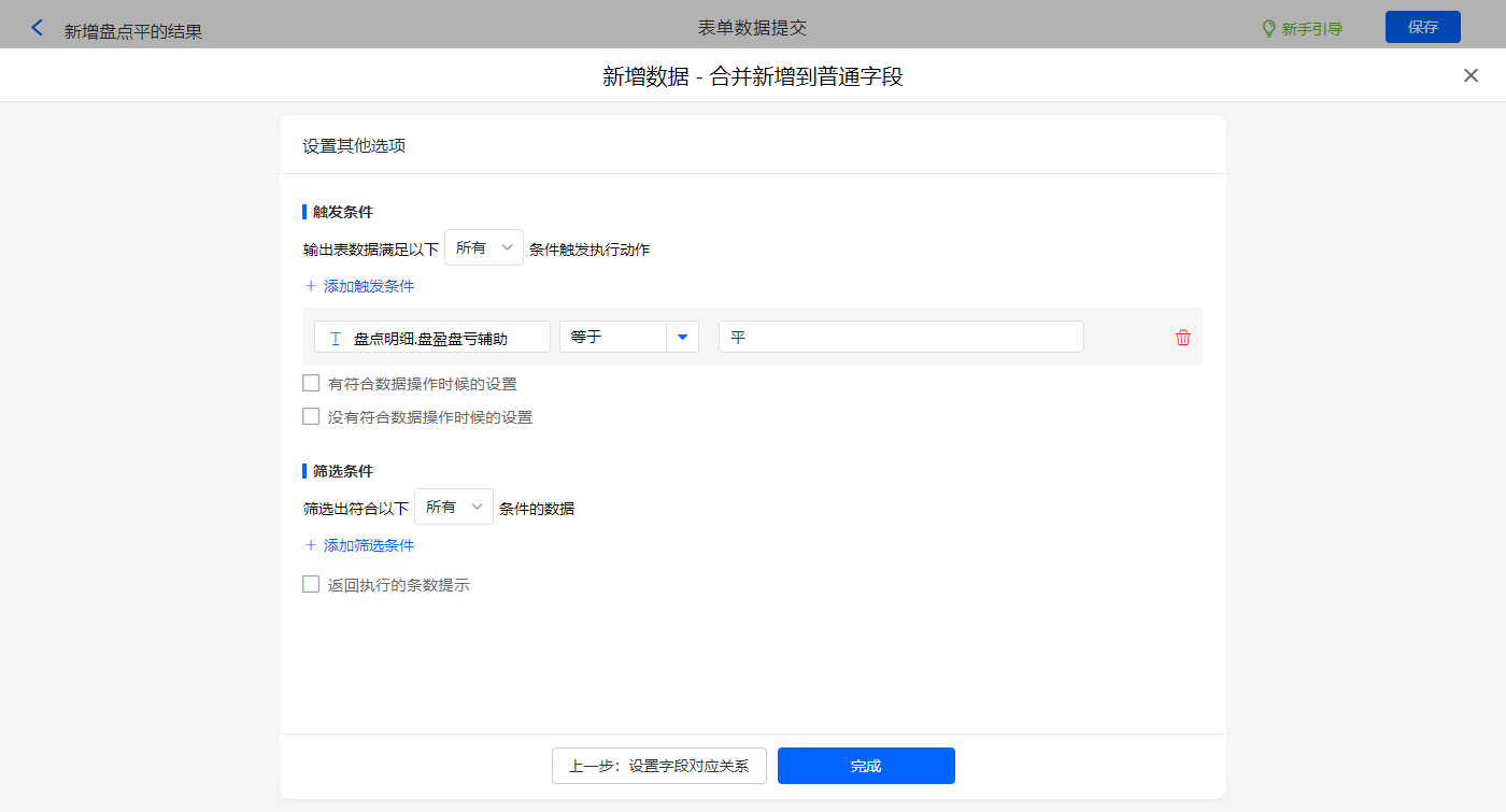其他设置的触发条件为【盘点明细.盘盈盘亏辅助】等于平,设置好点击【完成】并保存该数据助手;