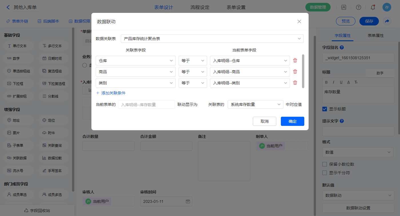1)【入库明细.库存数量】字段,默认值选择数据联动,设置联动条件及对应字段;