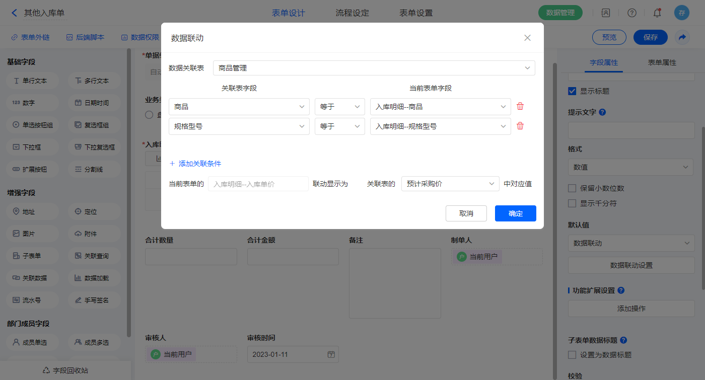 【入库明细.入库单价】字段,默认值选择数据联动,设置联动条件及对应字段;