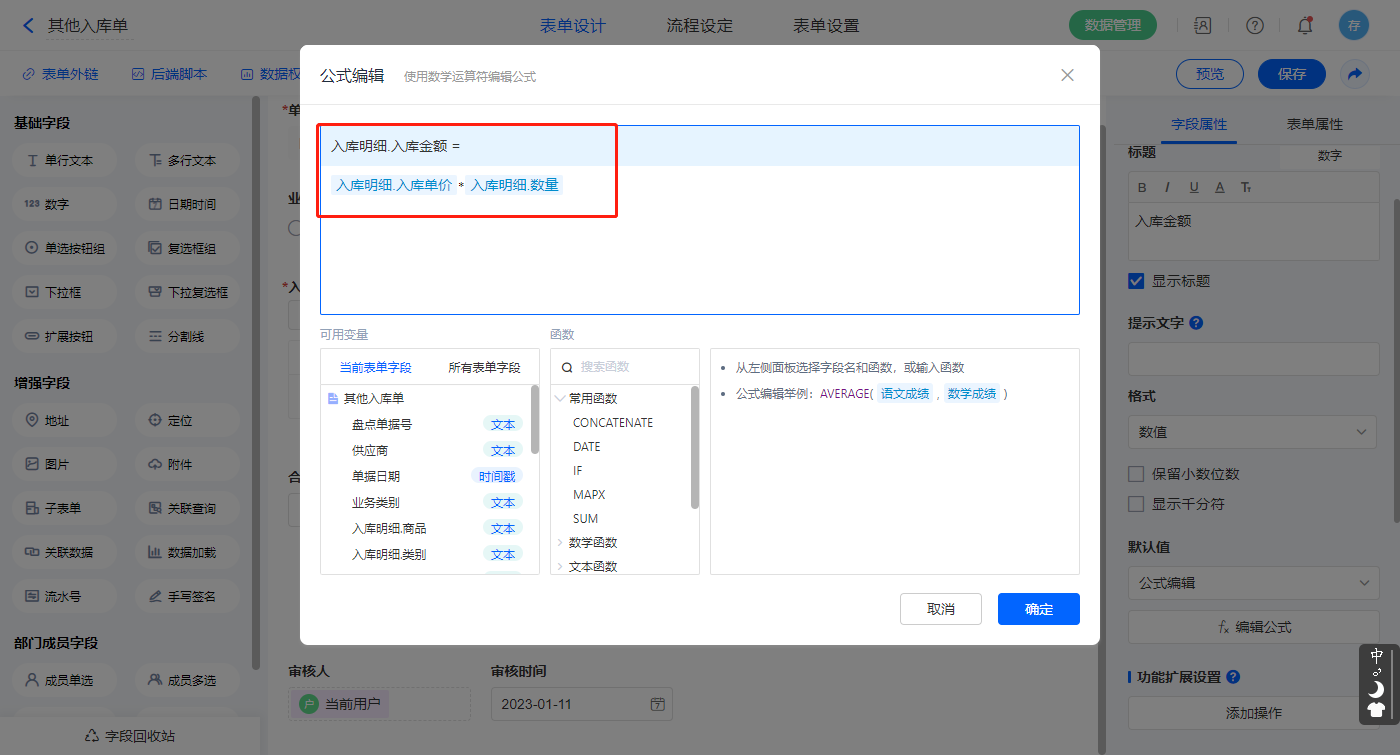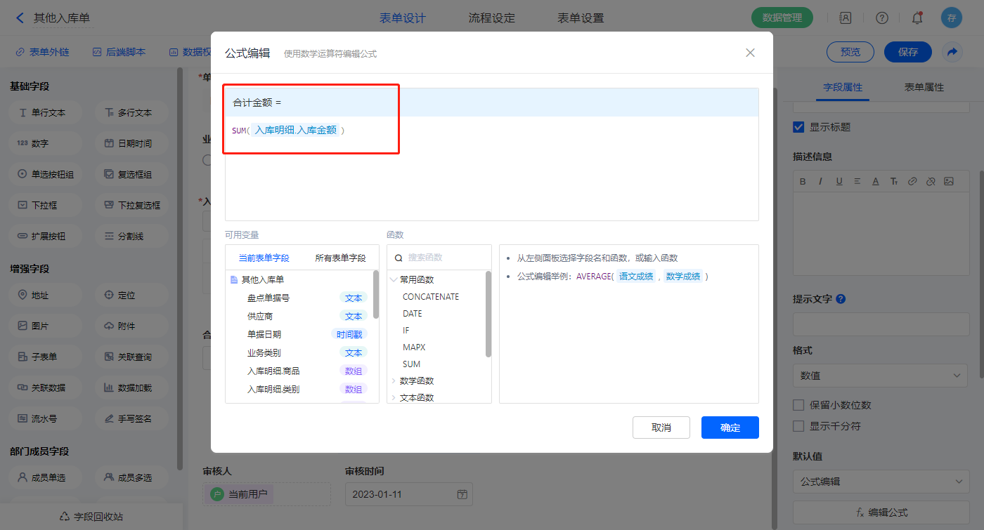 选择【入库明细.入库金额】字段,设置默认值为公式编辑,如图设置公式;