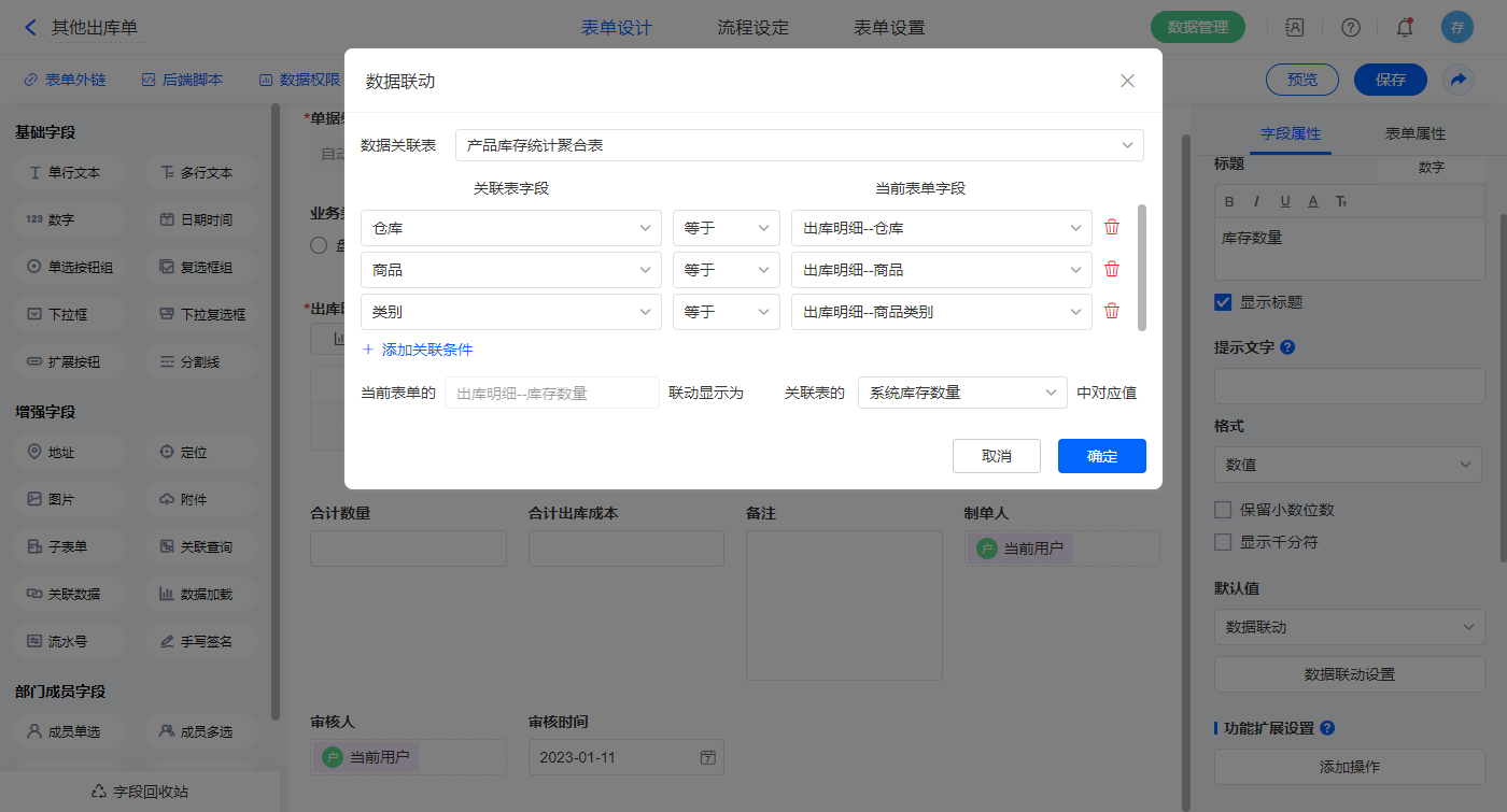 2)【出库明细.库存数量】字段,默认值选择数据联动,设置联动条件及对应字段;