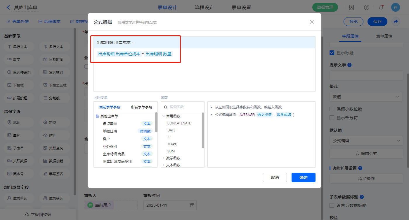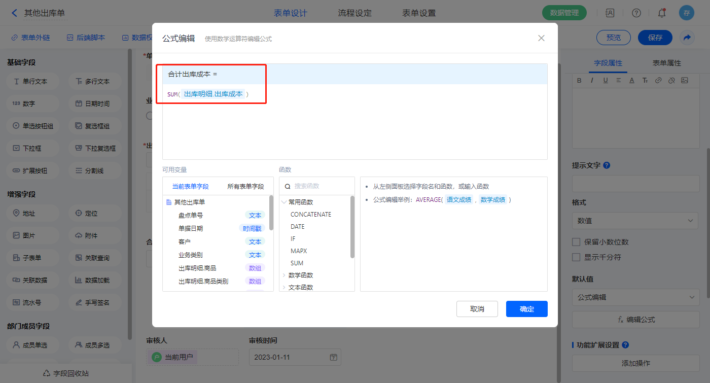 【合计出库成本】字段默认值设置为公式编辑,如图设置公式;