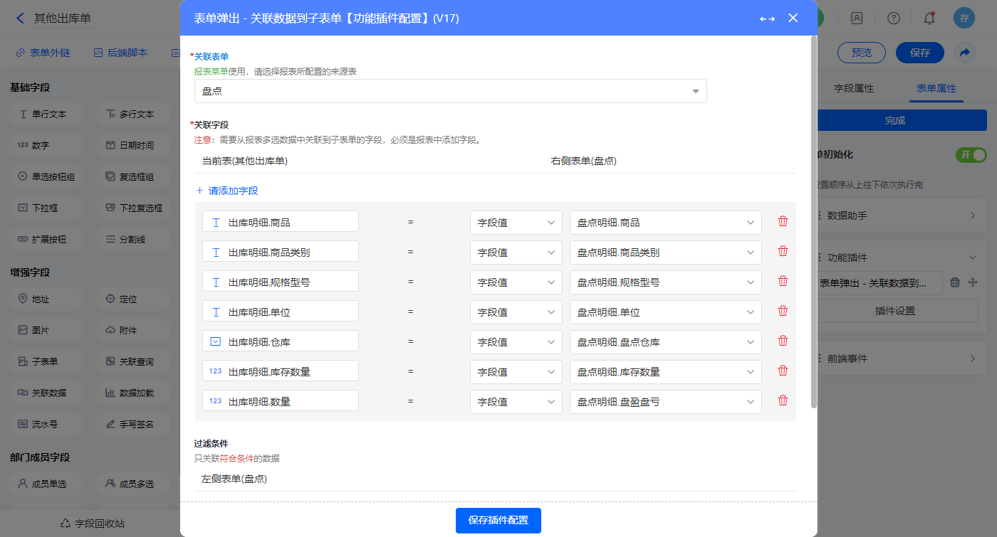 选择关联表单为表单【盘点】,添加该表的子表单字段对应表单的字段,设置完成点击【保存模块设置】;
