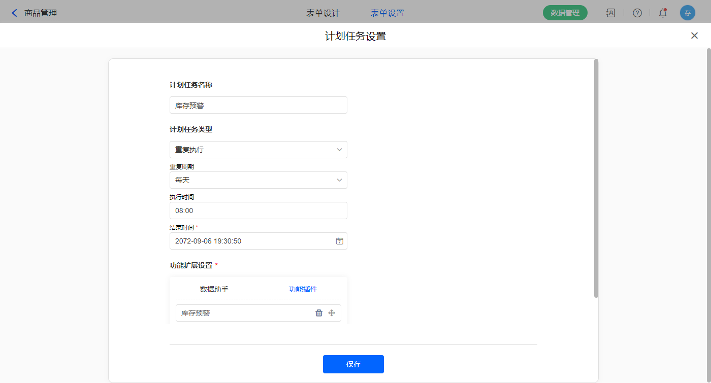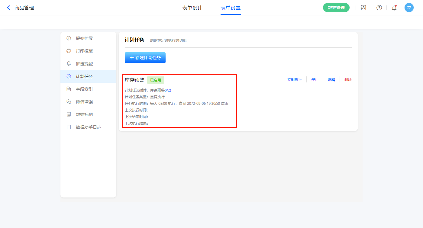 2)表单设置的计划任务新增库存预警任务;