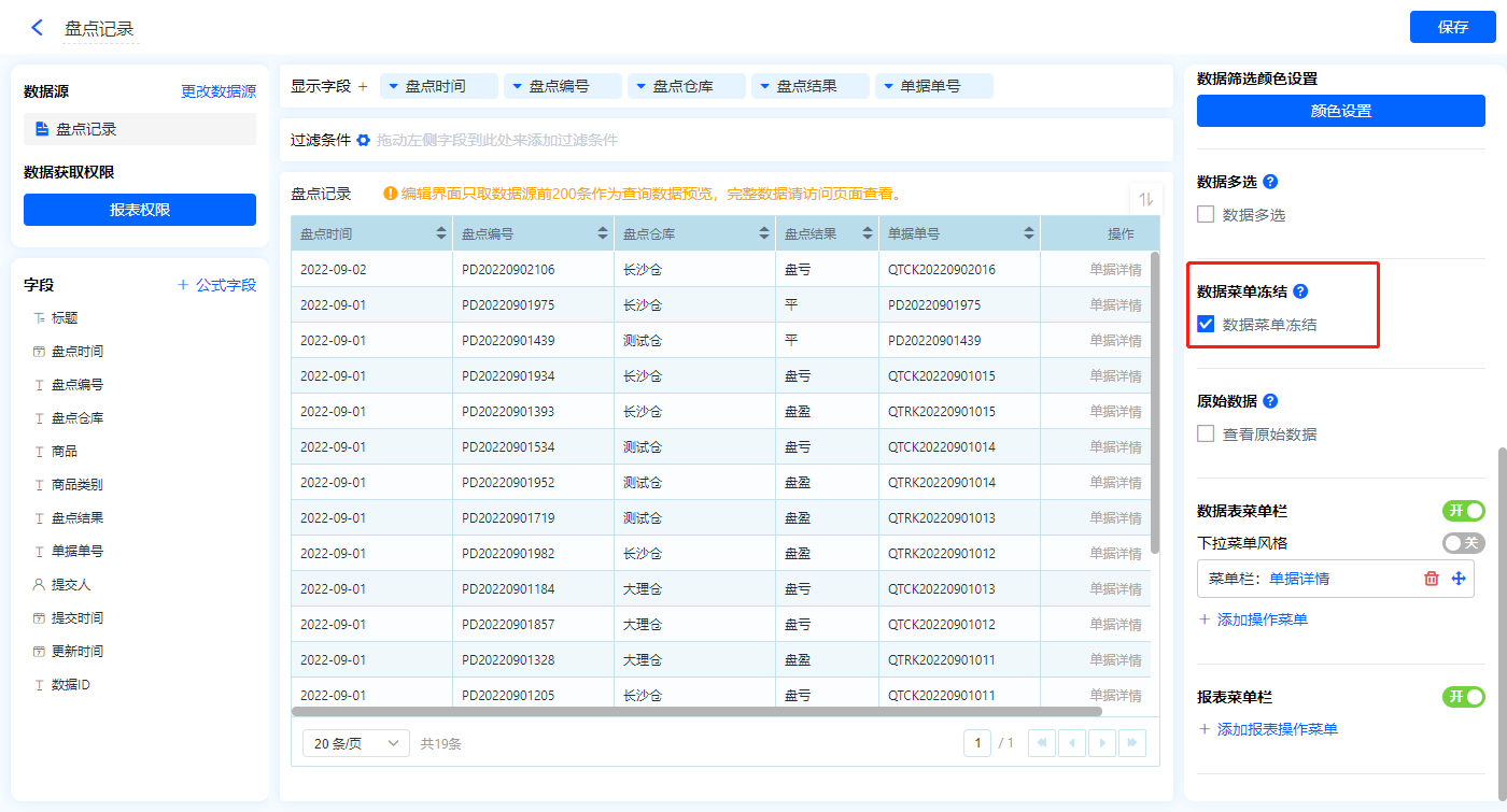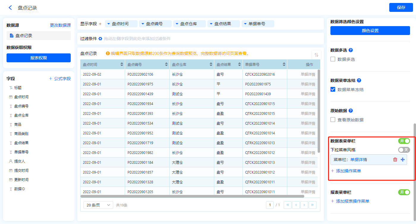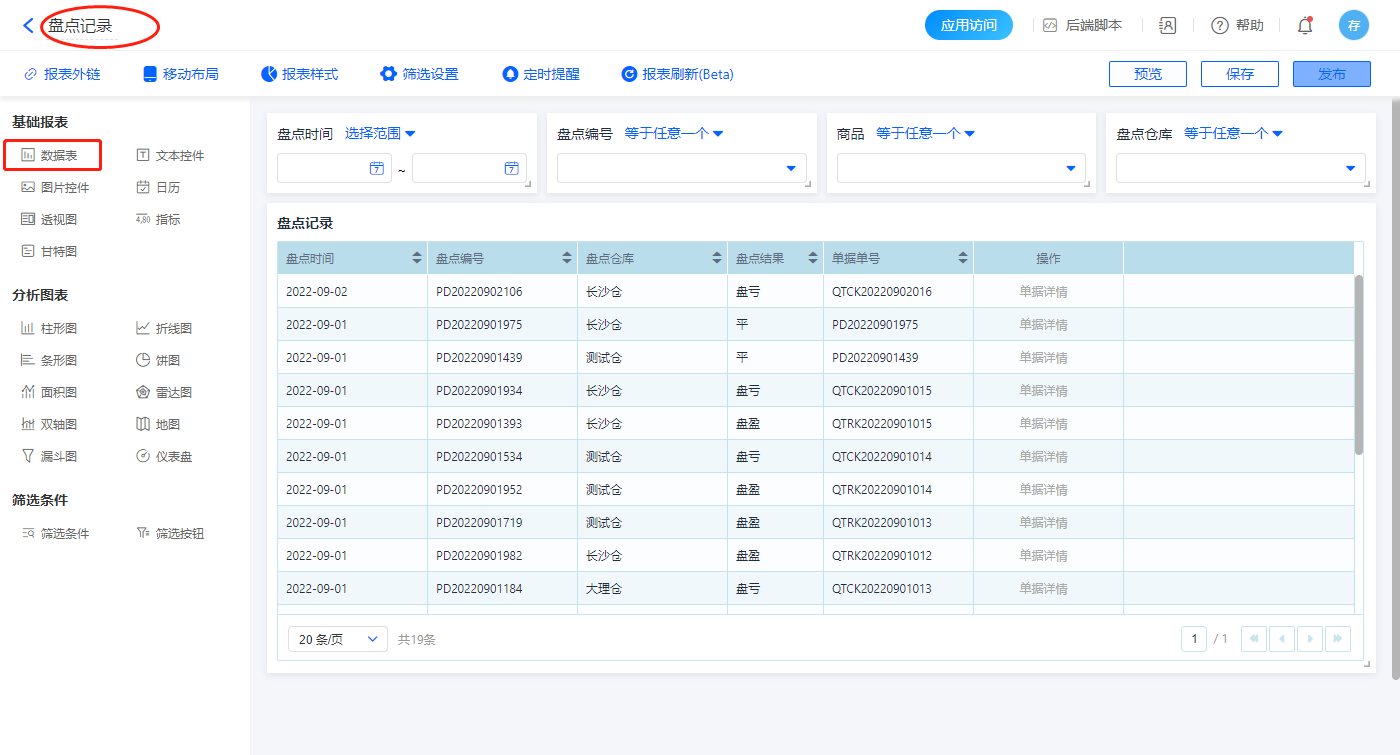 1)新增【盘点记录】报表,用基础报表【数据表】展示数据源为表单【盘点记录】的数据;