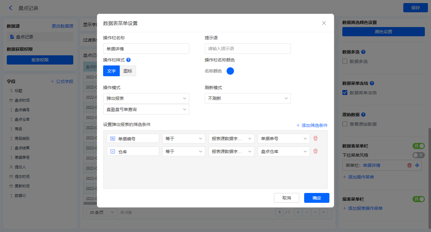 【单据详情】的菜单栏,操作模式设置为弹出报表【盘盈盘亏查询】,并设置报表筛选条件;