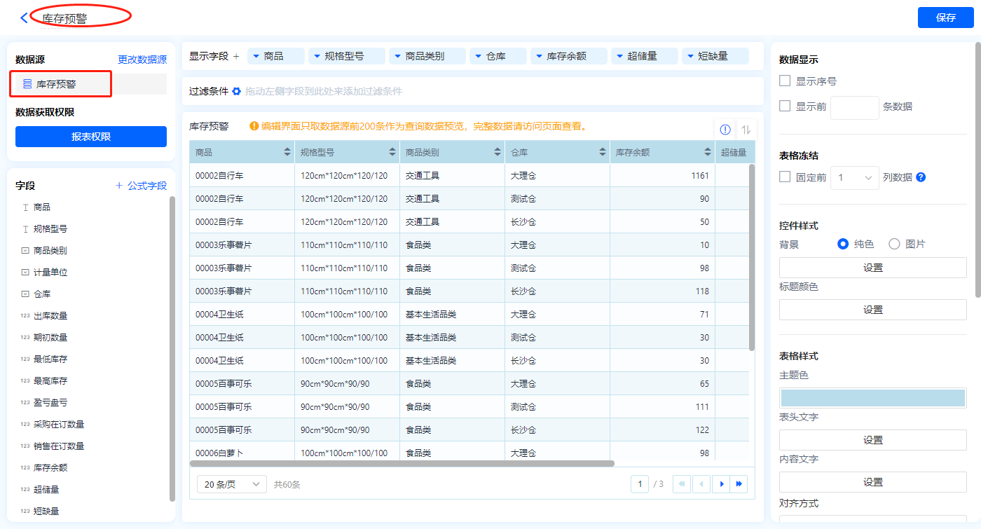 1)新增【智能补货】、【库存预警】报表,用基础报表【数据表】展示数据源为数据视图【库存预警】的数据;