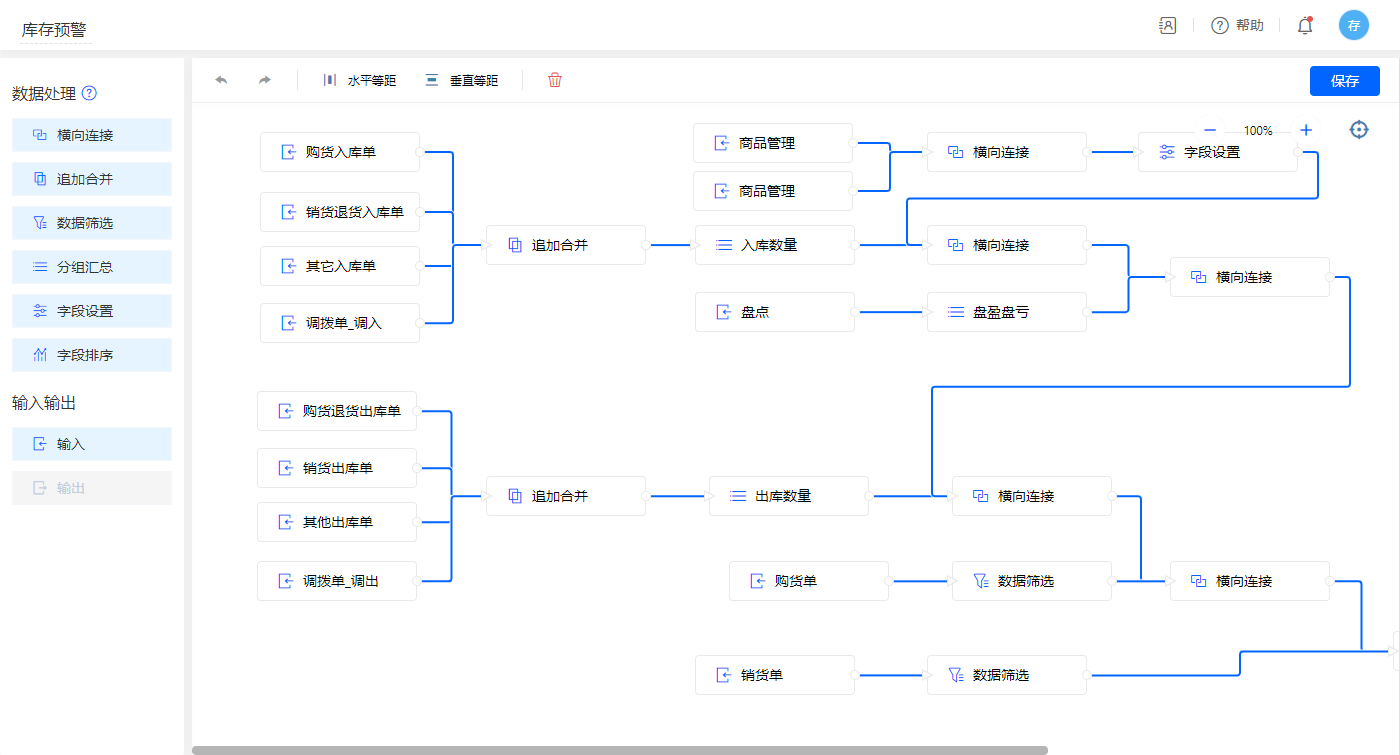 1)该应用运用到一个聚合表【产品库存统计聚合表】,两个数据视图【其他入库出库合并】、【库存预警】;