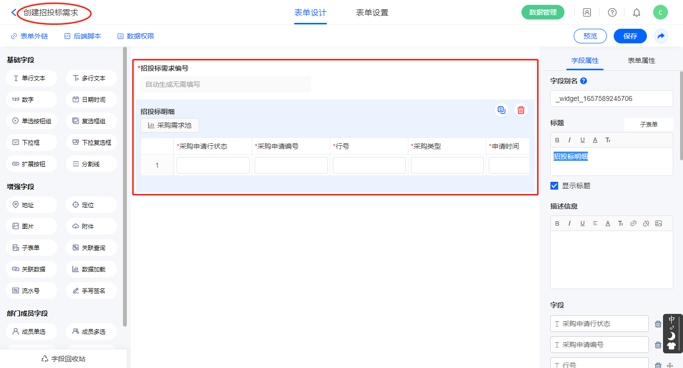 1)【招投标明细】子表单字段,开启数据加载,数据源为【采购需求池】,添加显示字段设置好赋值字段,点击保存;