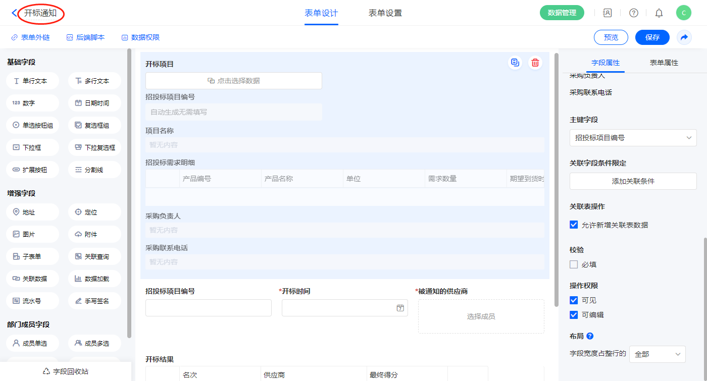 1)【开标项目】关联数据字段,关联表单【邀标】,如图设置显示字段,主键字段为【招投标项目编号】;