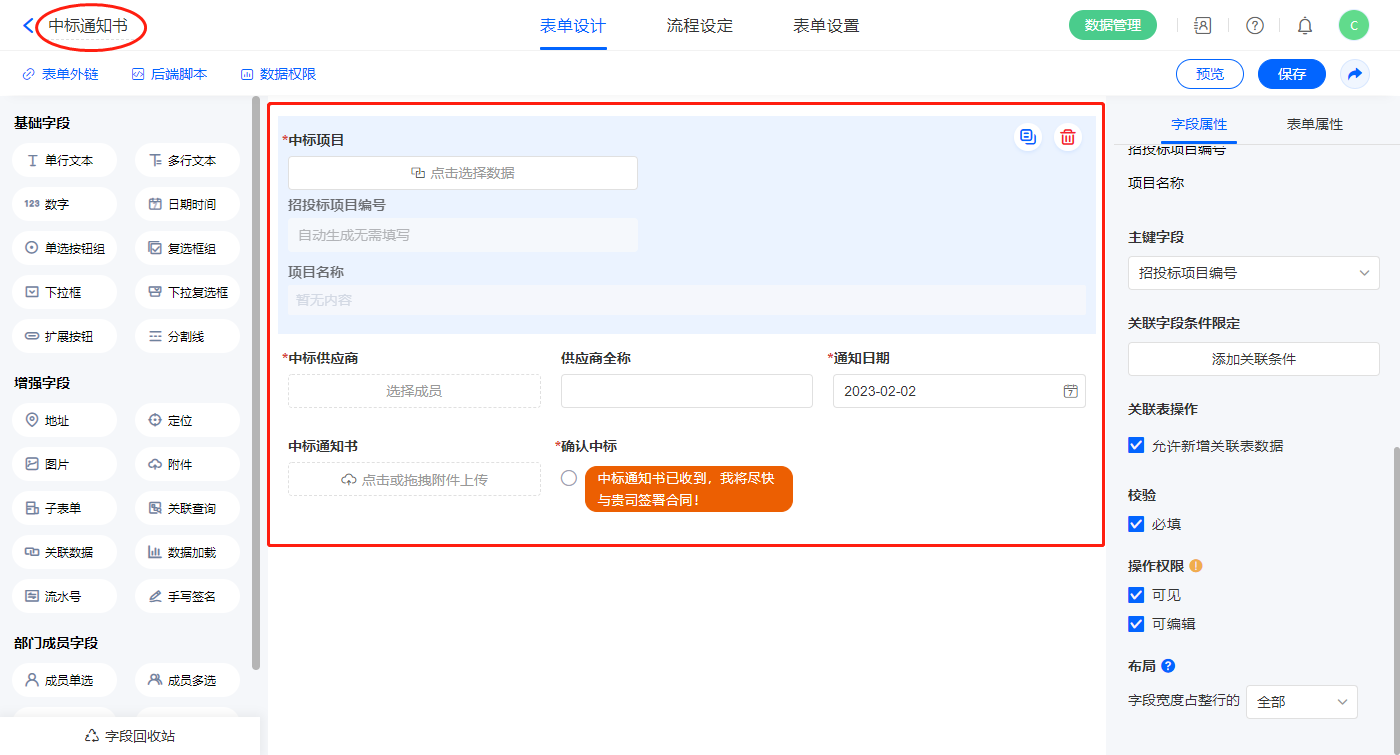 2.10、表单【中标通知书】字段及表单属性设置