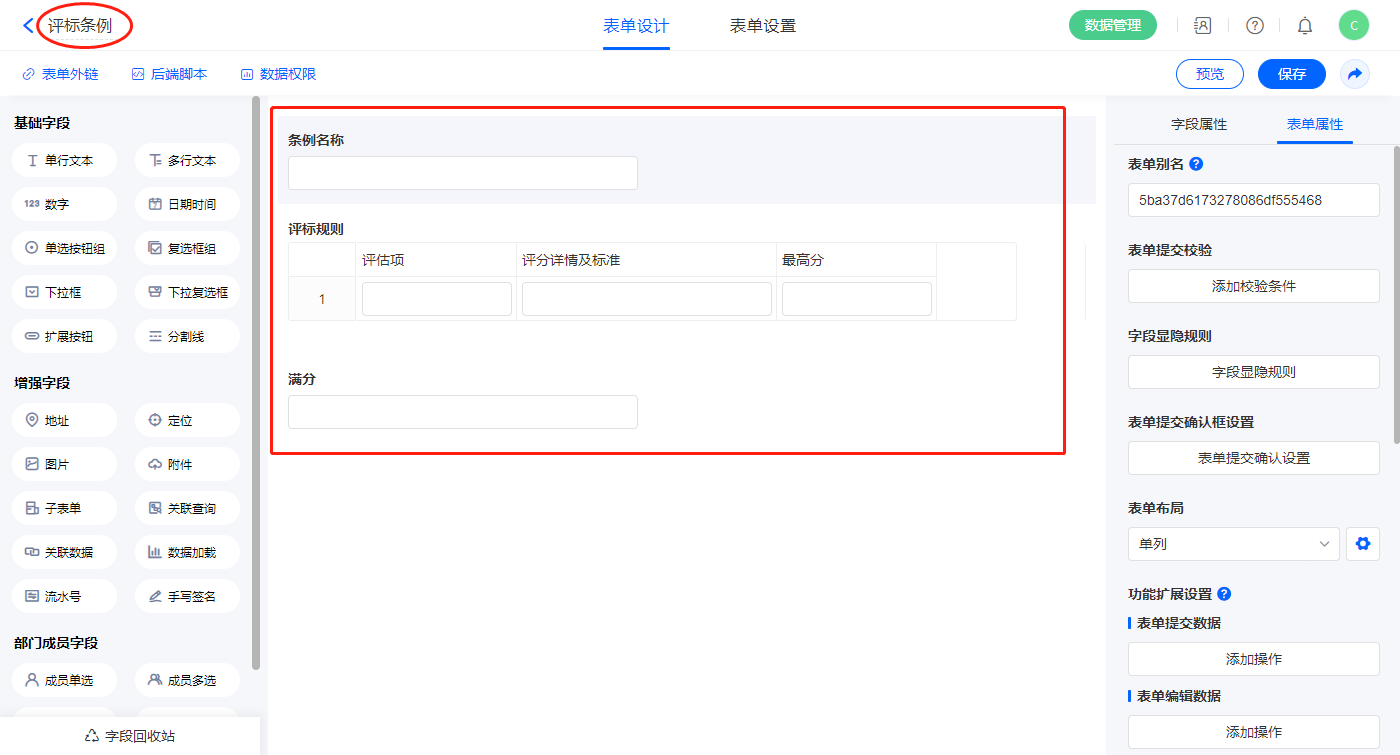12)新增表单【评标条例】,字段设置如下;