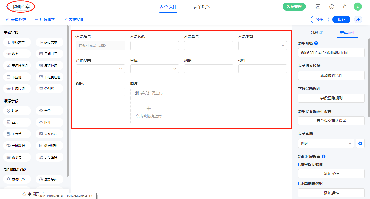 13)新增表单【物料档案】,字段设置如下;