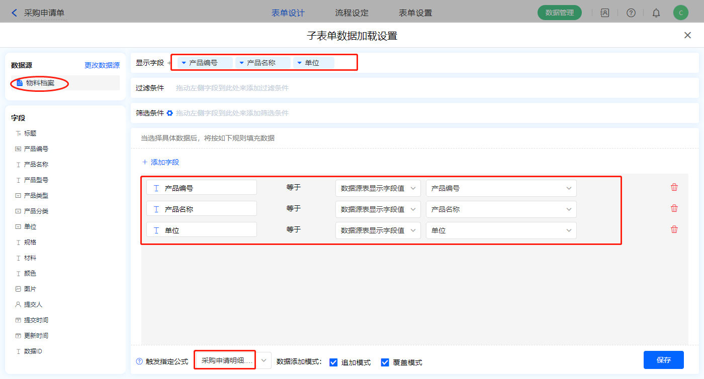 2)【采购申请明细】子表单字段,开启数据加载,数据源为【物料档案】,添加显示字段设置好赋值字段,触发公式为【随机码】字段,点击保存;
