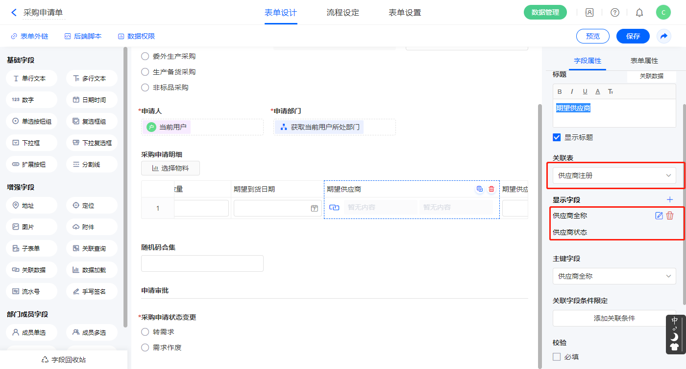 3)【采购申请明细.期望供应商】关联数据字段,关联表单【供应商注册】,如图设置显示字段,主键字段为【供应商全称】;