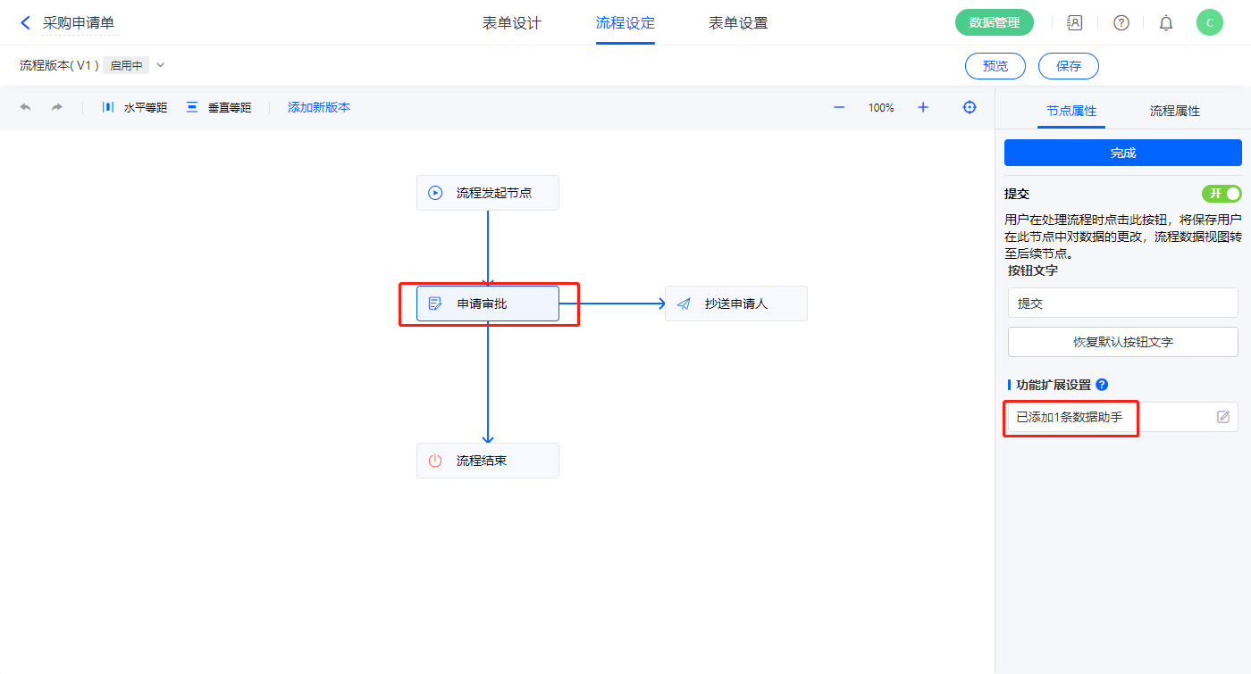 4)该表单是流程表单,设置流程节点,申请审批的节点权限提交设置一条数据助手;
