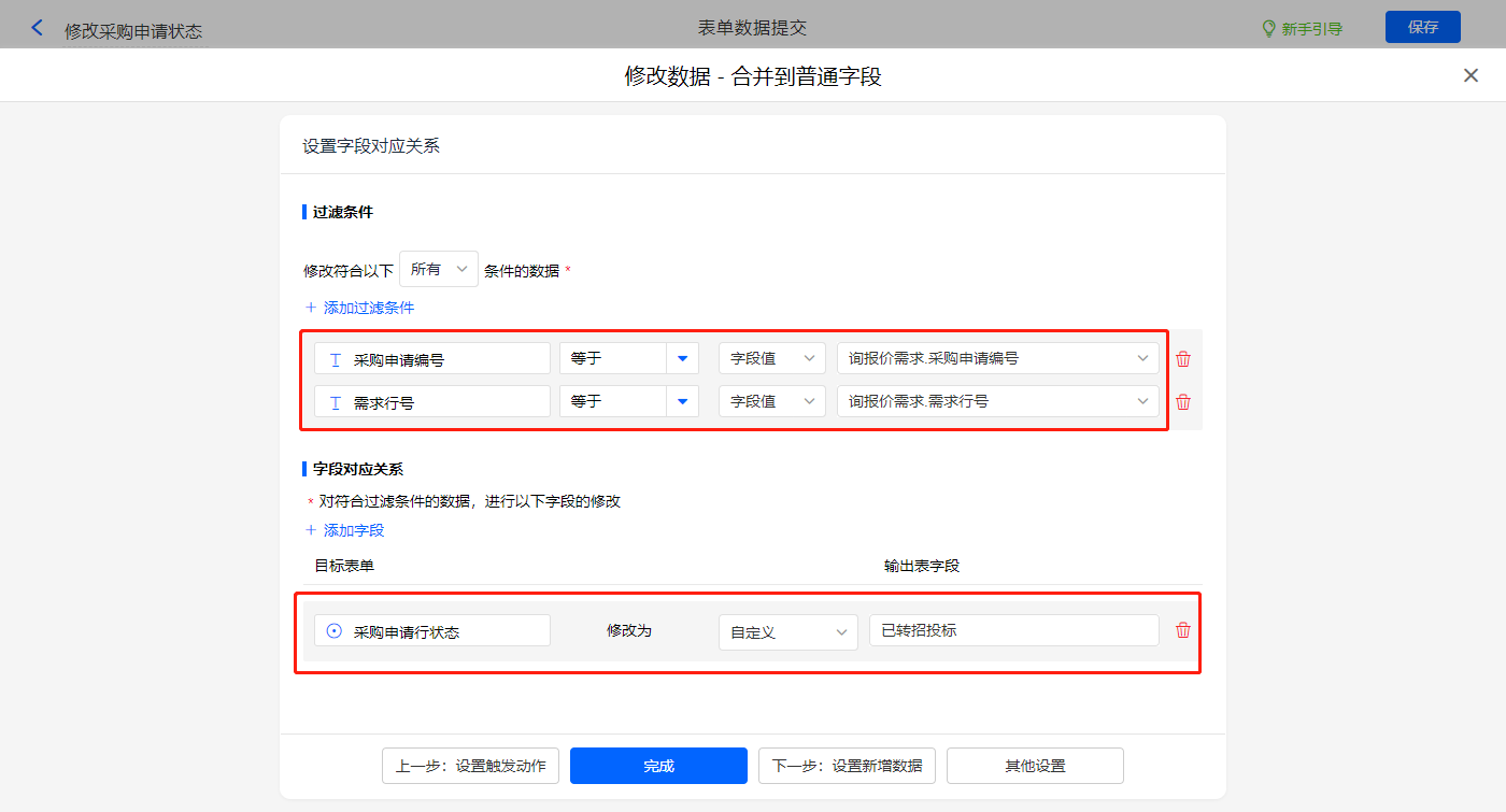 新增修改数据的执行动作,选择修改【采购需求池】表单,选择对应过滤条件,以及需要修改的字段,设置好点击【完成】并保存该数据助手;