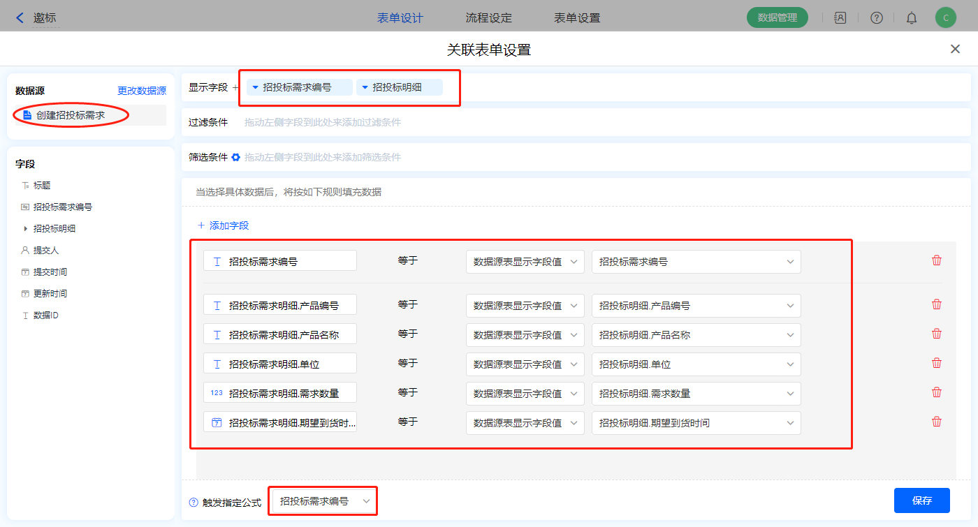 1)【招投标需求选择】数据加载字段,数据源为【创建招投标需求】,添加显示字段设置好赋值字段,触发公式为【招投标需求编号】字段,点击保存;