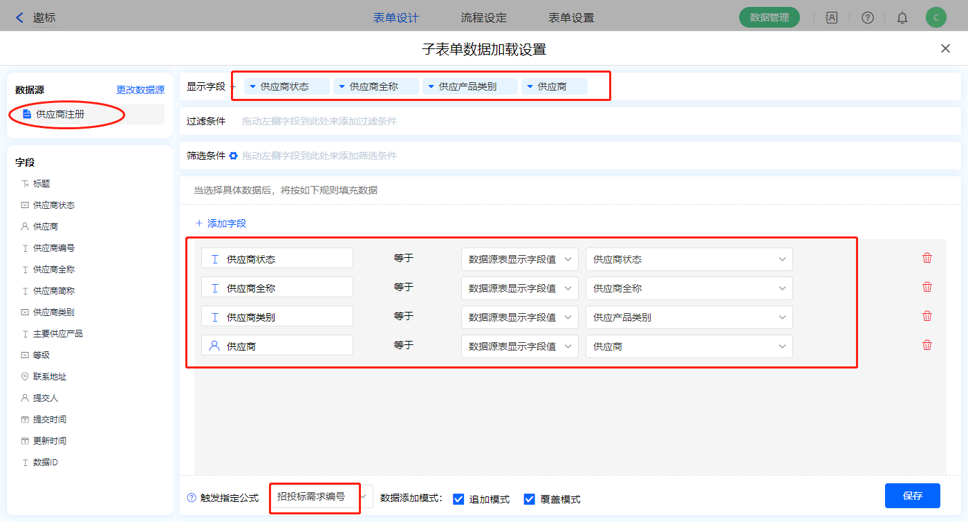 2)【选择要邀请的供应商】子表单字段,开启数据加载,数据源为【供应商注册】,添加显示字段设置好赋值字段,触发公式为【招投标需求编号】字段,点击保存;