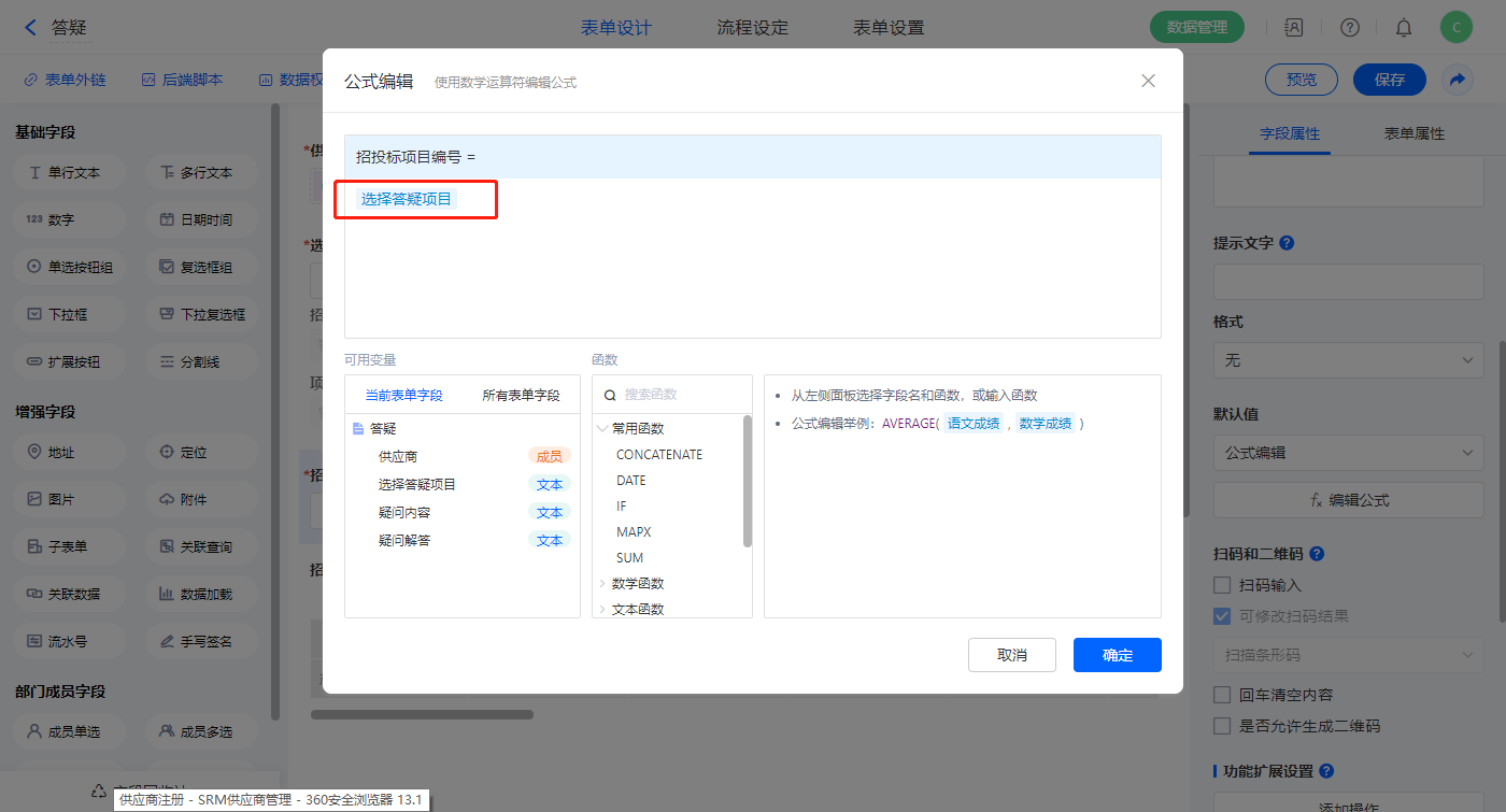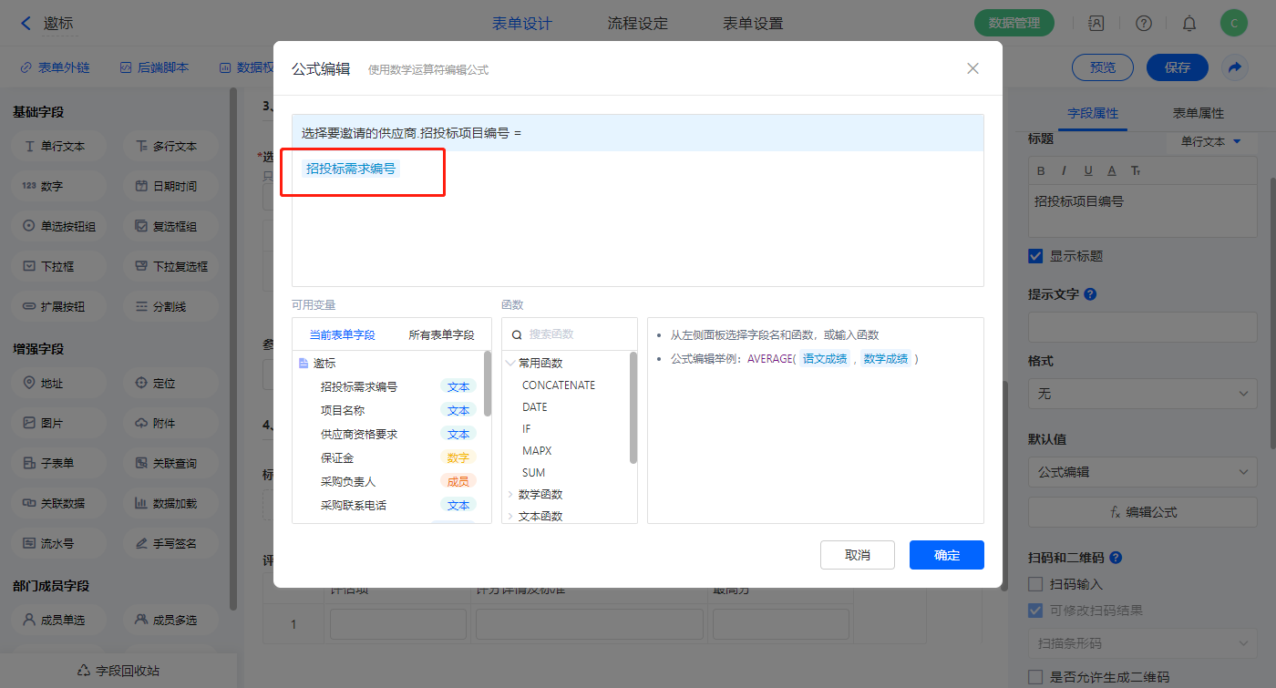 【选择要邀请的供应商.招投标项目编号】字段,设置默认值为公式编辑,如图设置公式;