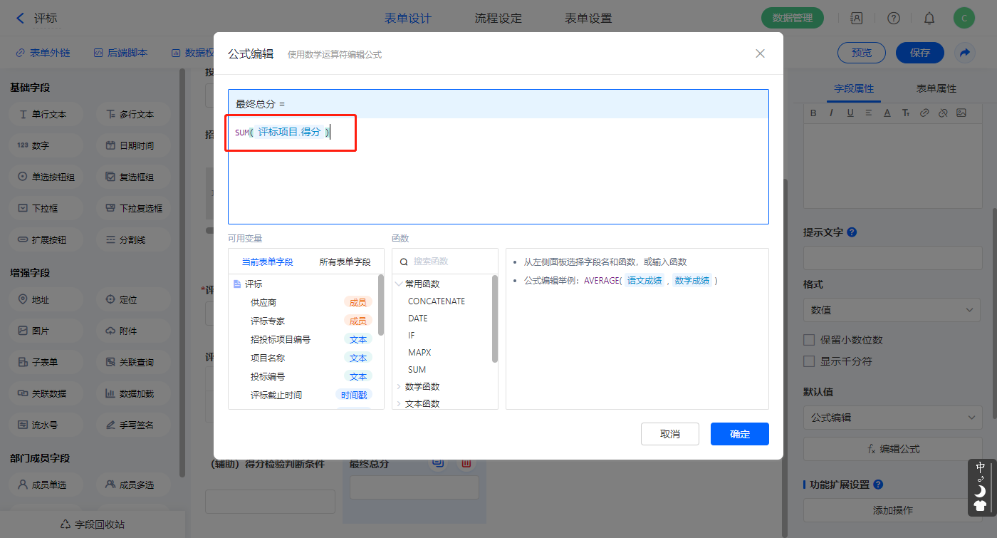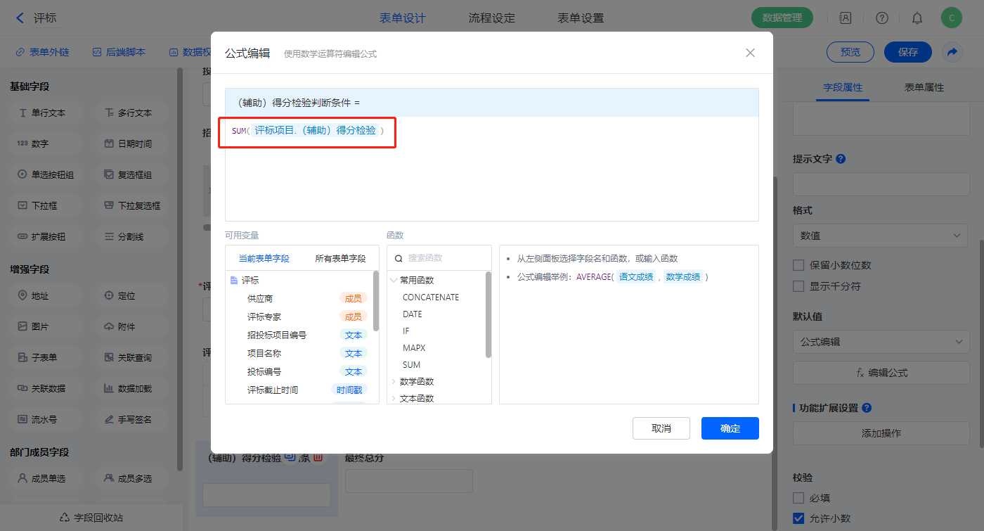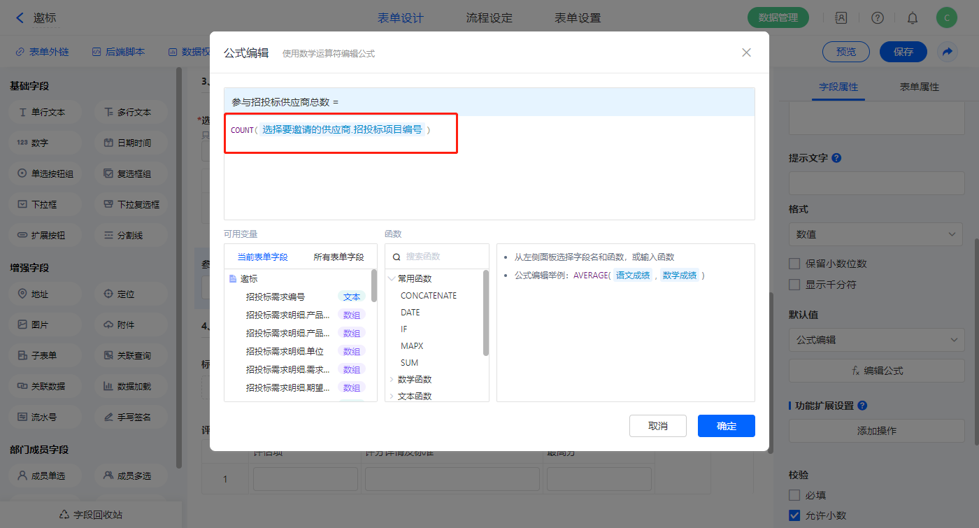 【参与招投标供应商总数】字段,设置默认值为公式编辑,如图设置公式;