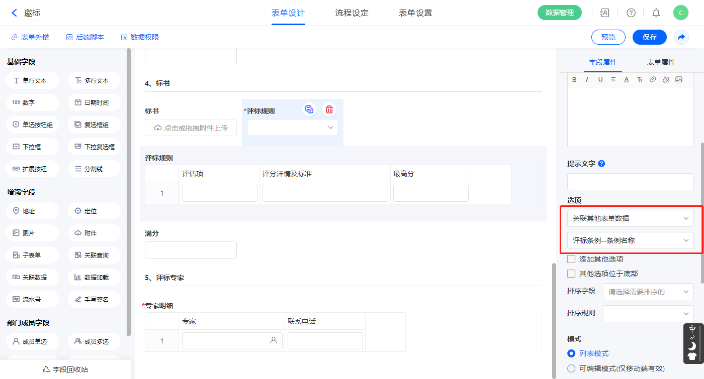 3)【评标规则】字段,选择设置为关联其他表单数据,关联评标条例的【条例名称】字段;