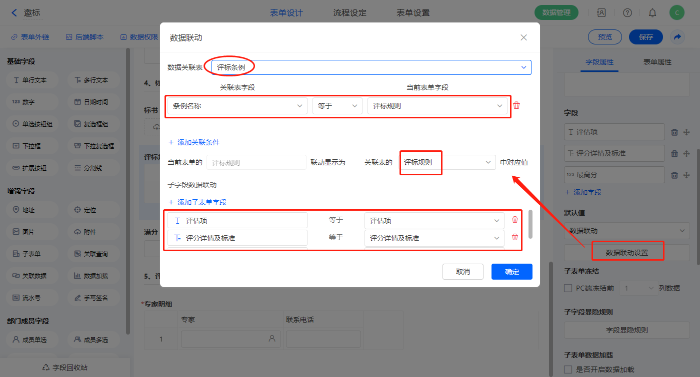 【评标人】子表单字段设置默认值为数据联动,设置联动条件及联动字段;