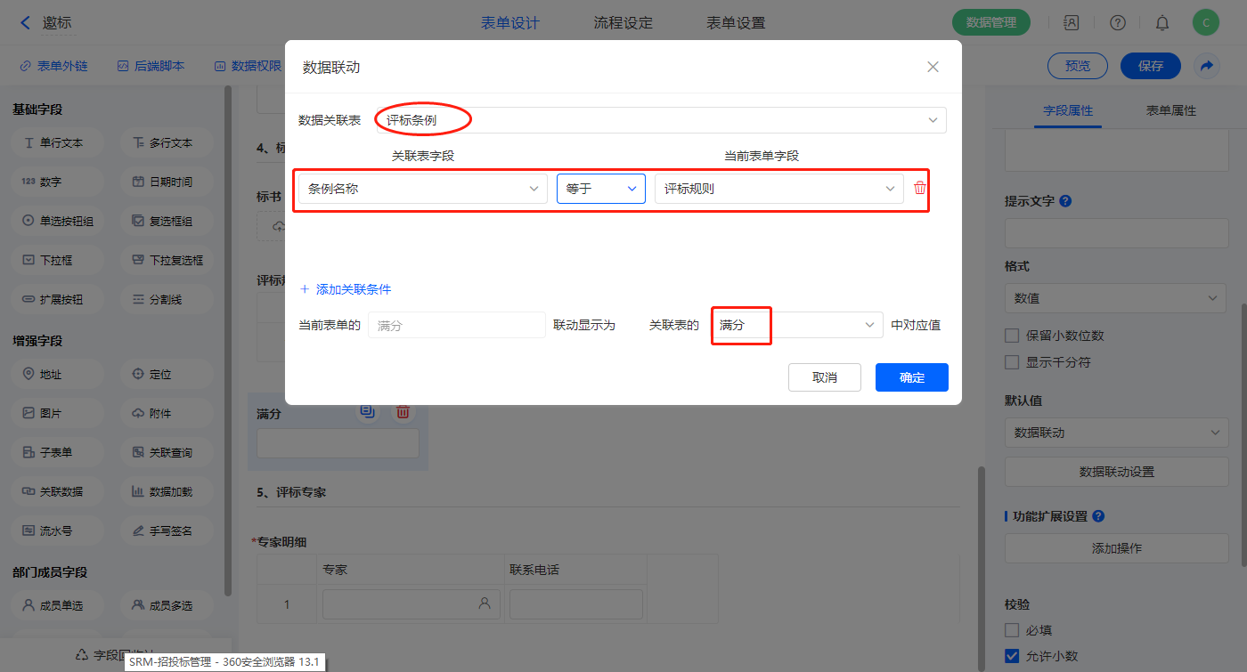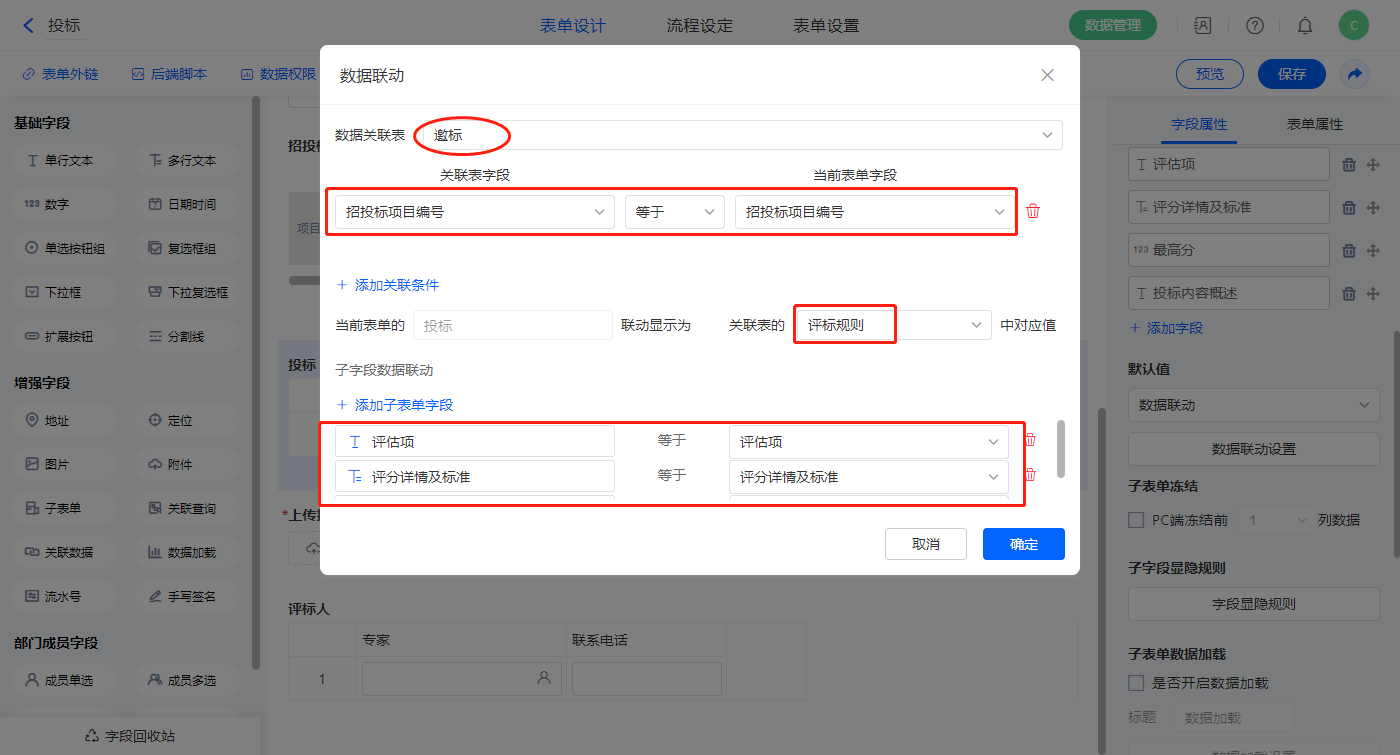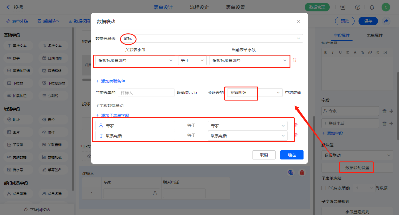 【投标】子表单字段设置默认值为数据联动,设置联动条件及联动字段;