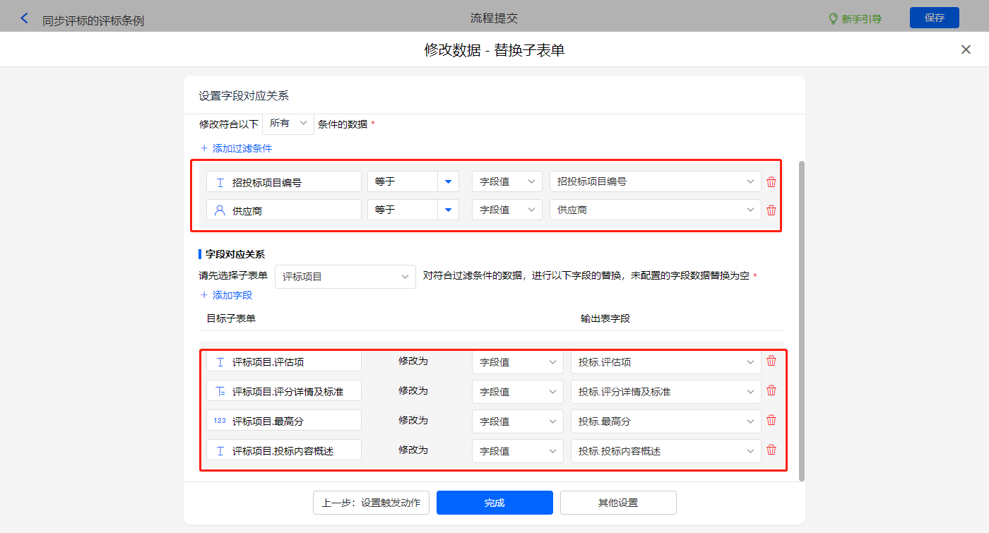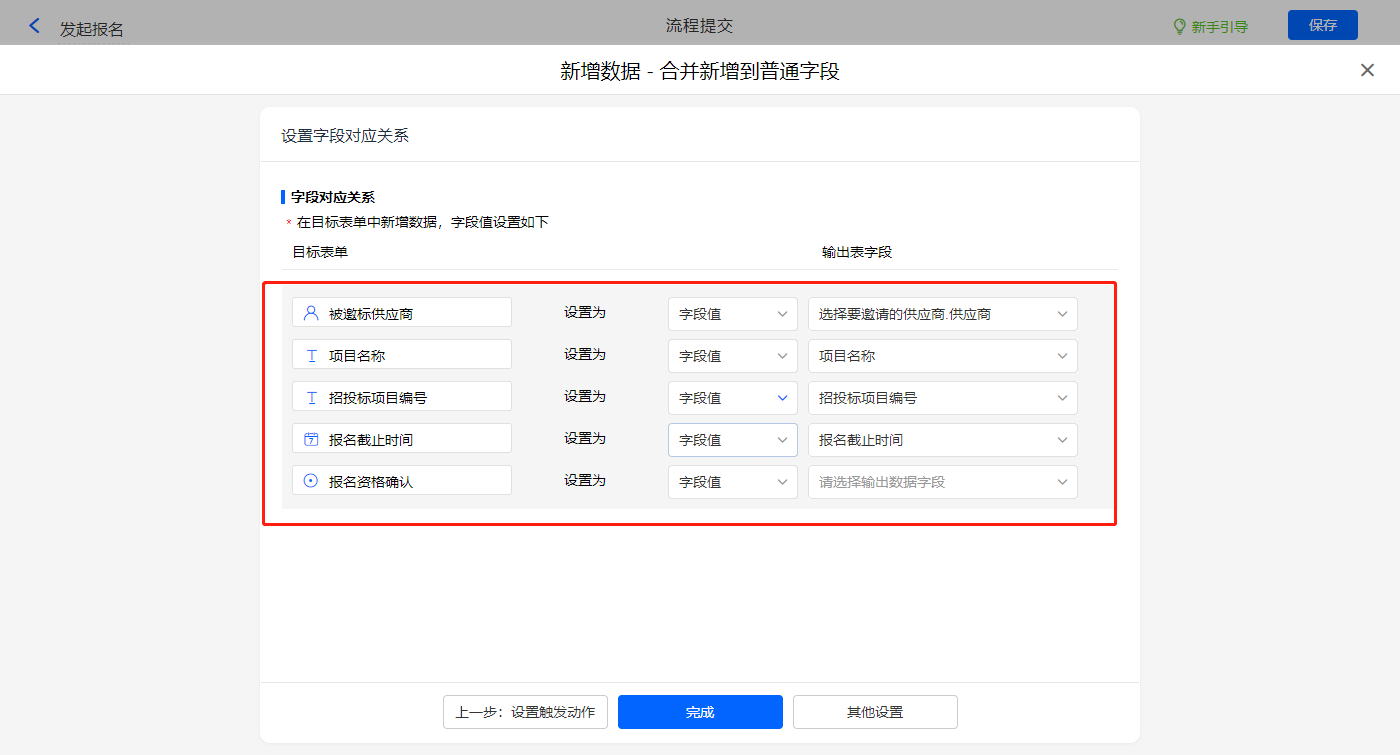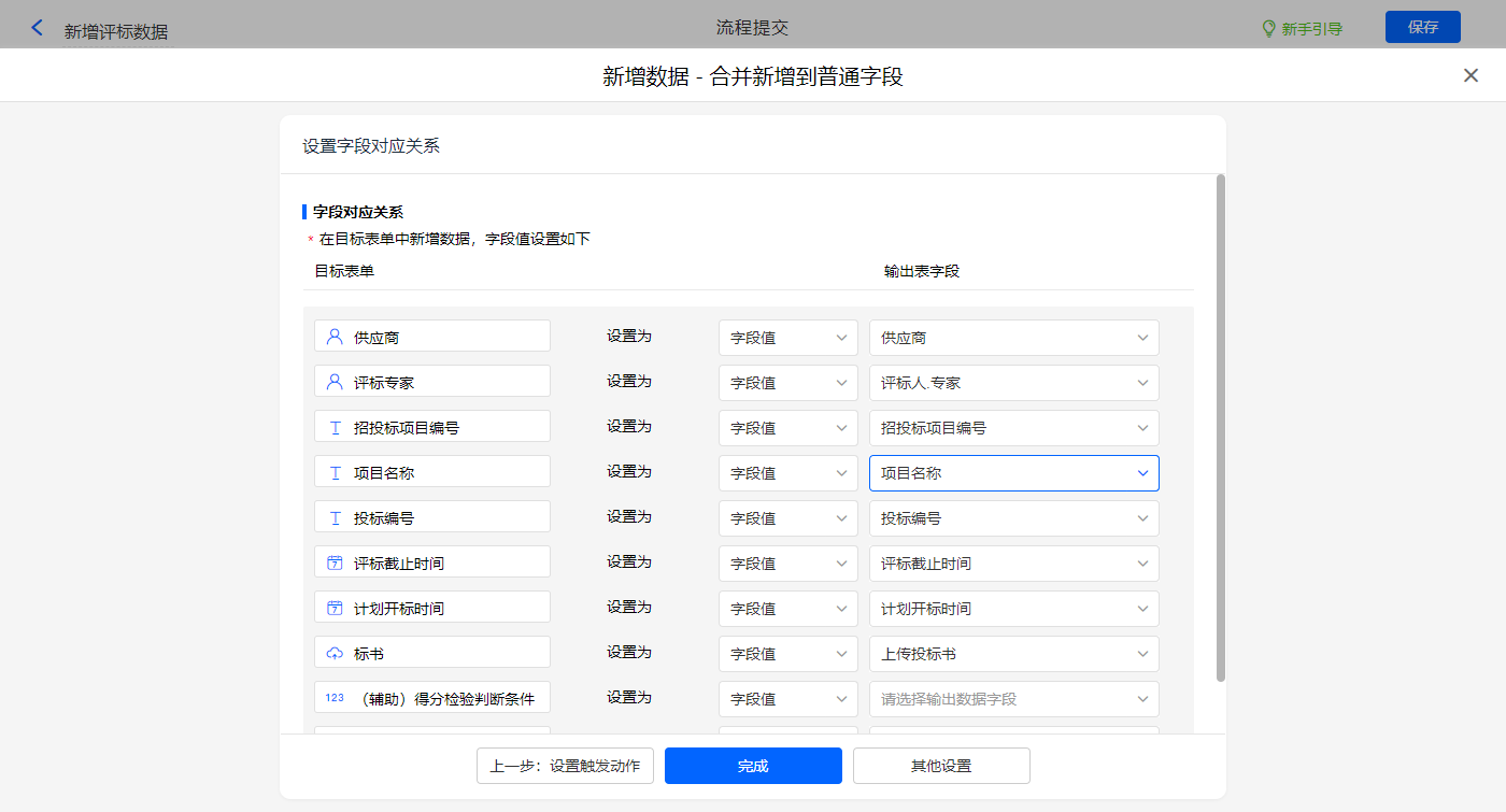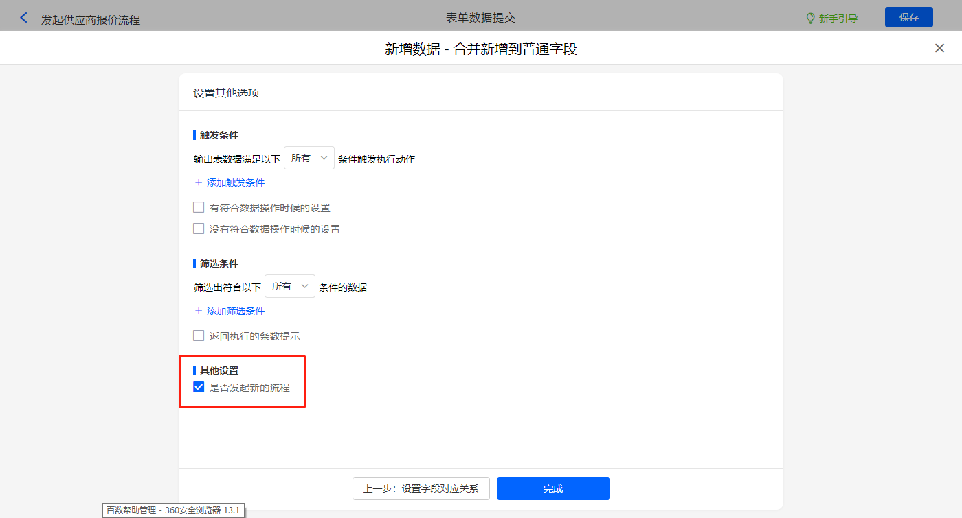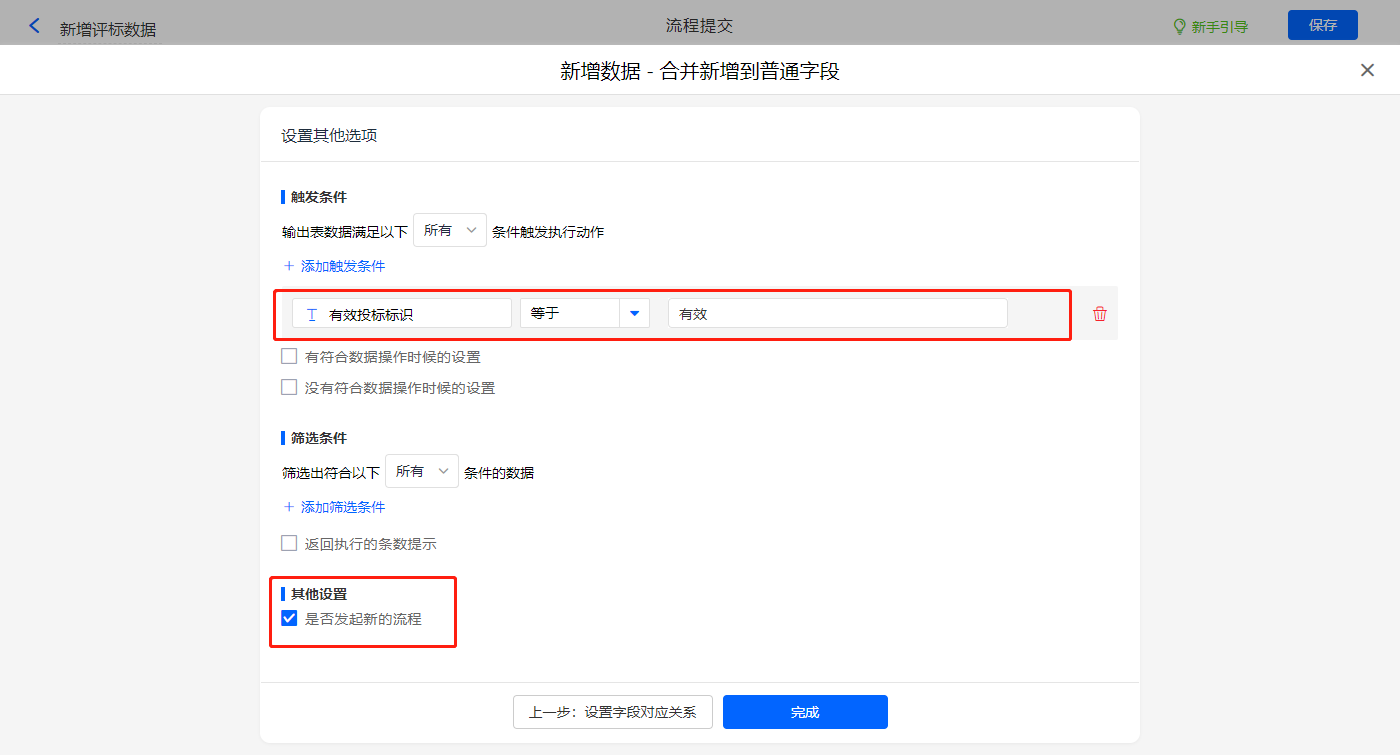 其他设置触发条件为【有效投标标识】字段等于有效,勾选是否发起新流程,设置好点击【完成】并保存该数据助手;