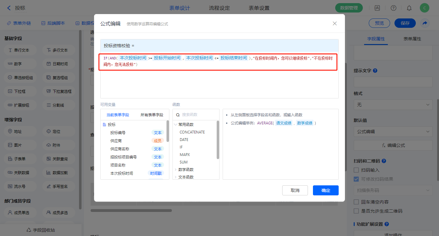 【投标资格校验】字段,设置默认值为公式编辑,设置公式:“IF(AND(本次投标时间>=投标开始时间,本次投标时间<=投标结束时间),"在投标时间内,您可以继续投标","不在投标时间内,您无法投标")”;