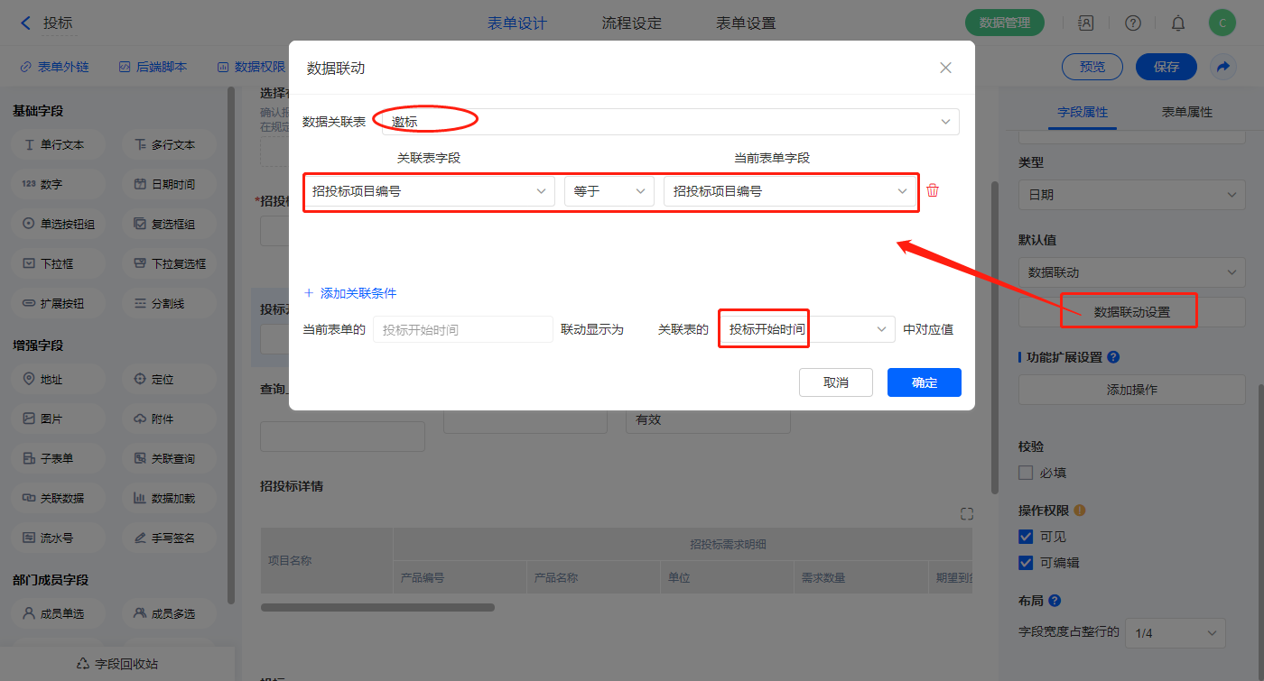 【投标开始时间】、【投标结束时间】、【评标截止时间】、【计划开标时间】字段设置默认值为数据联动,关联表及关联条件相同,设置对应的联动字段即可;