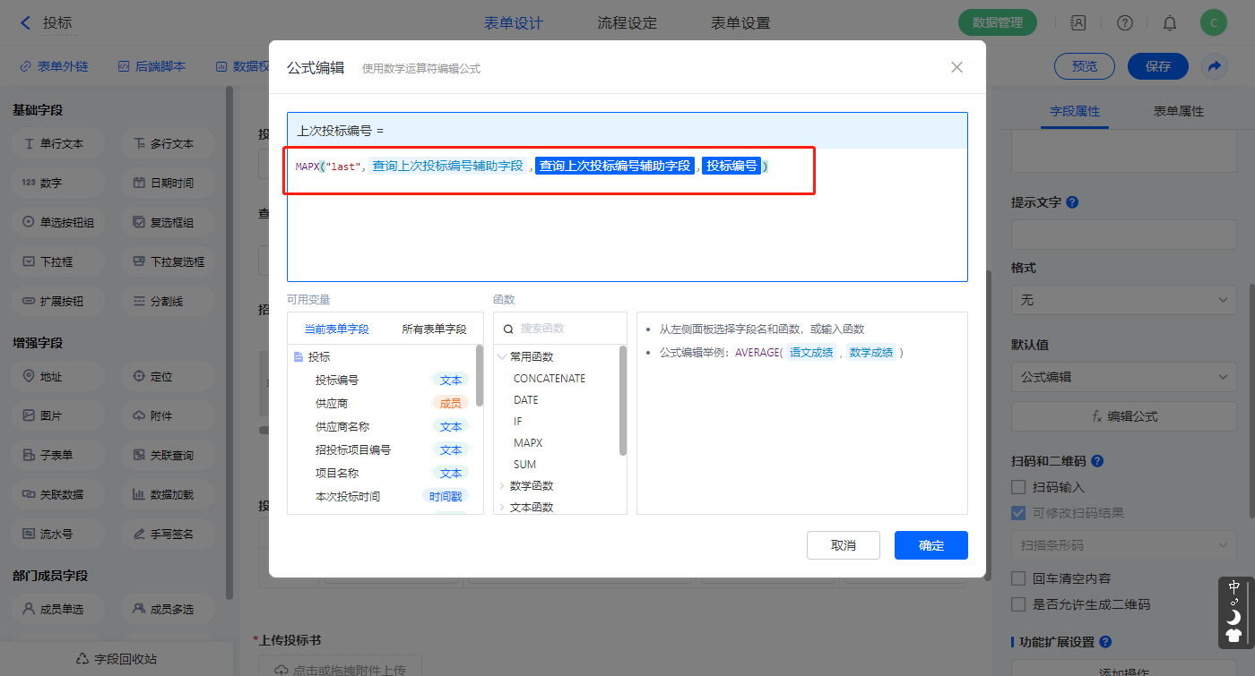 【查询上次投标编号辅助字段】字段,设置默认值为公式编辑,如图设置公式;