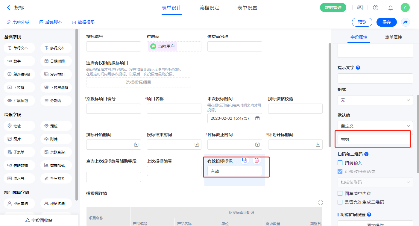 【有效投标标识】字段,设置默认值为“有效”;