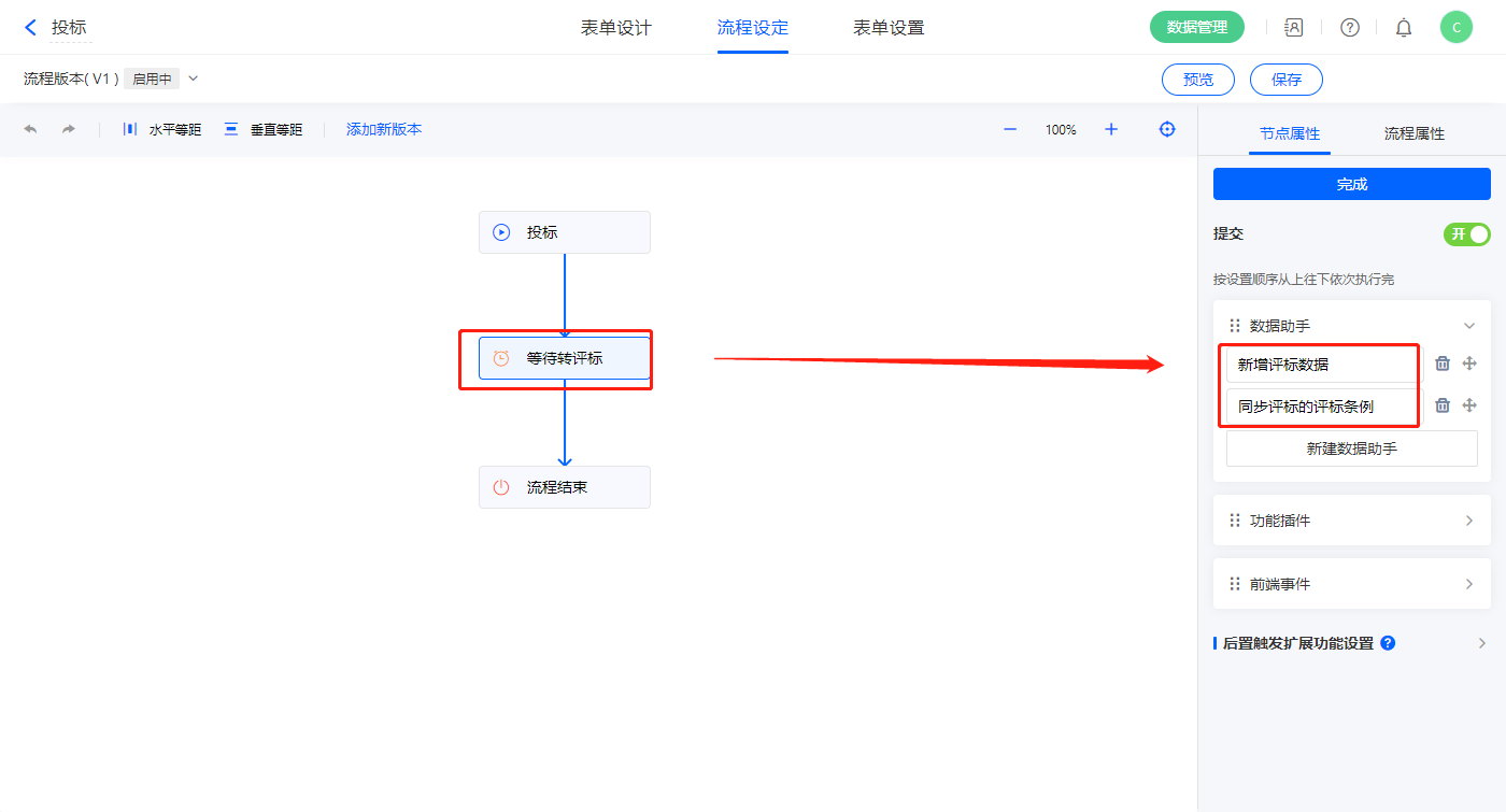 2)该表单是流程表单,设置流程节点,等待转评标节点的节点权限提交设置两条数据助手;