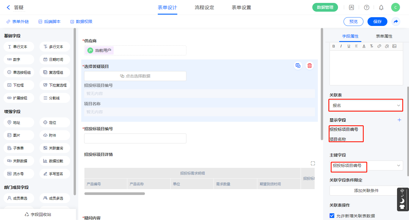 1)【选择答疑项目】关联数据字段,关联表单【报名】,如图设置显示字段,主键字段为【招投标项目编号】;