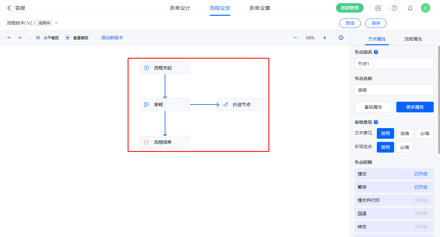 4)该表单是流程表单,设置流程节点及节点权限,保存表单;