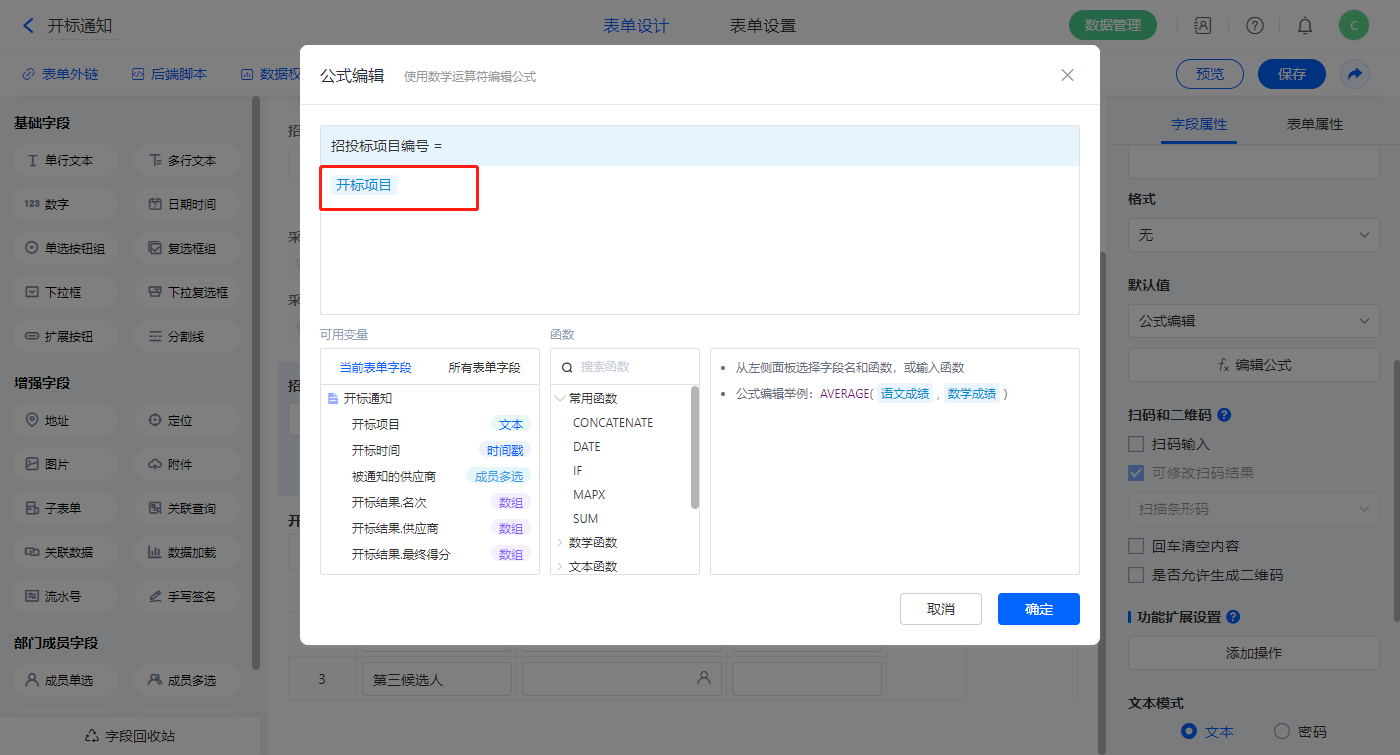 【招投标项目编号】字段,设置默认值为公式编辑,如图设置公式;