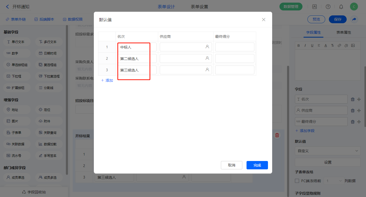 【开标结果】子表单字段如图设置默认值;