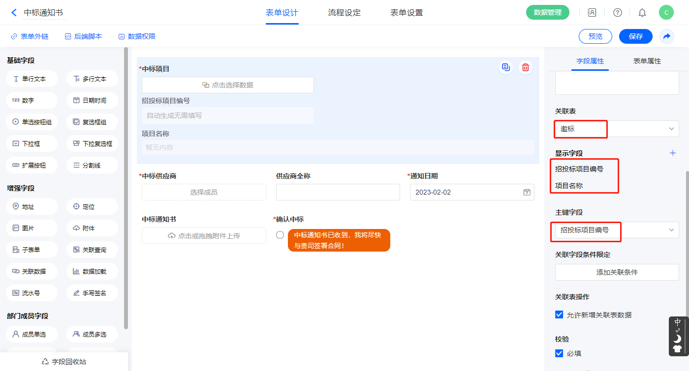 1)【中标项目】关联数据字段,关联表单【邀标】,如图设置显示字段,主键字段为【招投标项目编号】;