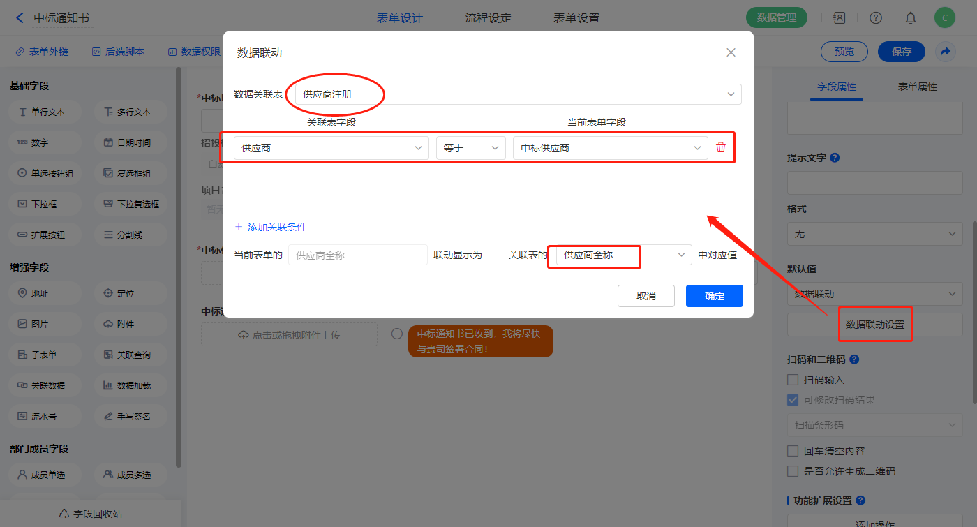 2)【供应商名称】字段设置默认值为数据联动,设置联动条件及联动字段;