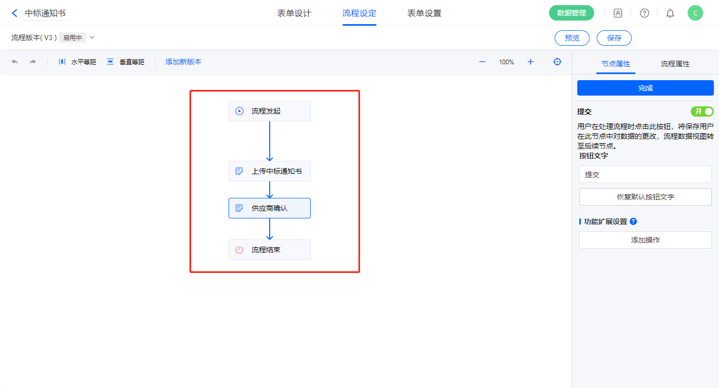 5)该表单是流程表单,设置流程节点,邀标申请节点的节点权限提交设置一条数据助手名称为发起报名;
