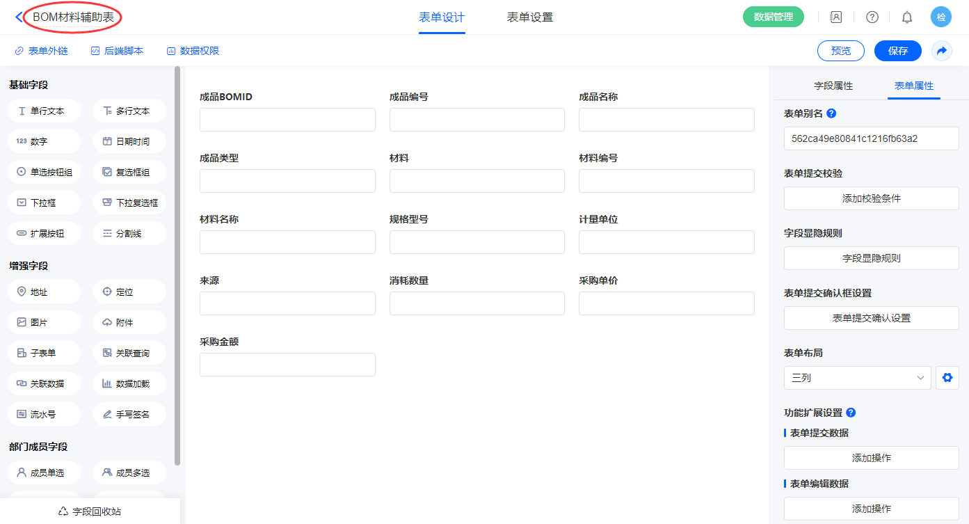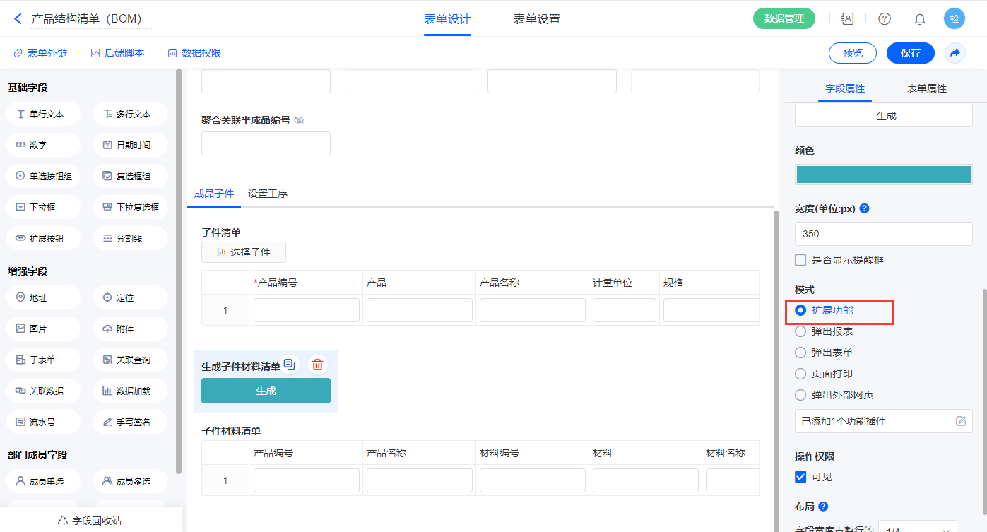 2.4、表单【产品结构清单(BOM)】字段及表单属性设置