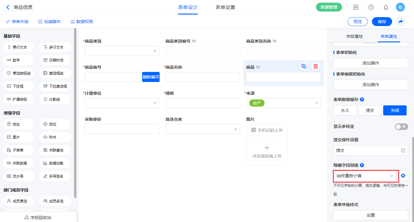 6)表单属性里隐藏字段赋值,设置为始终重新计算; 注:所有表单的该属性设置都如此设置;