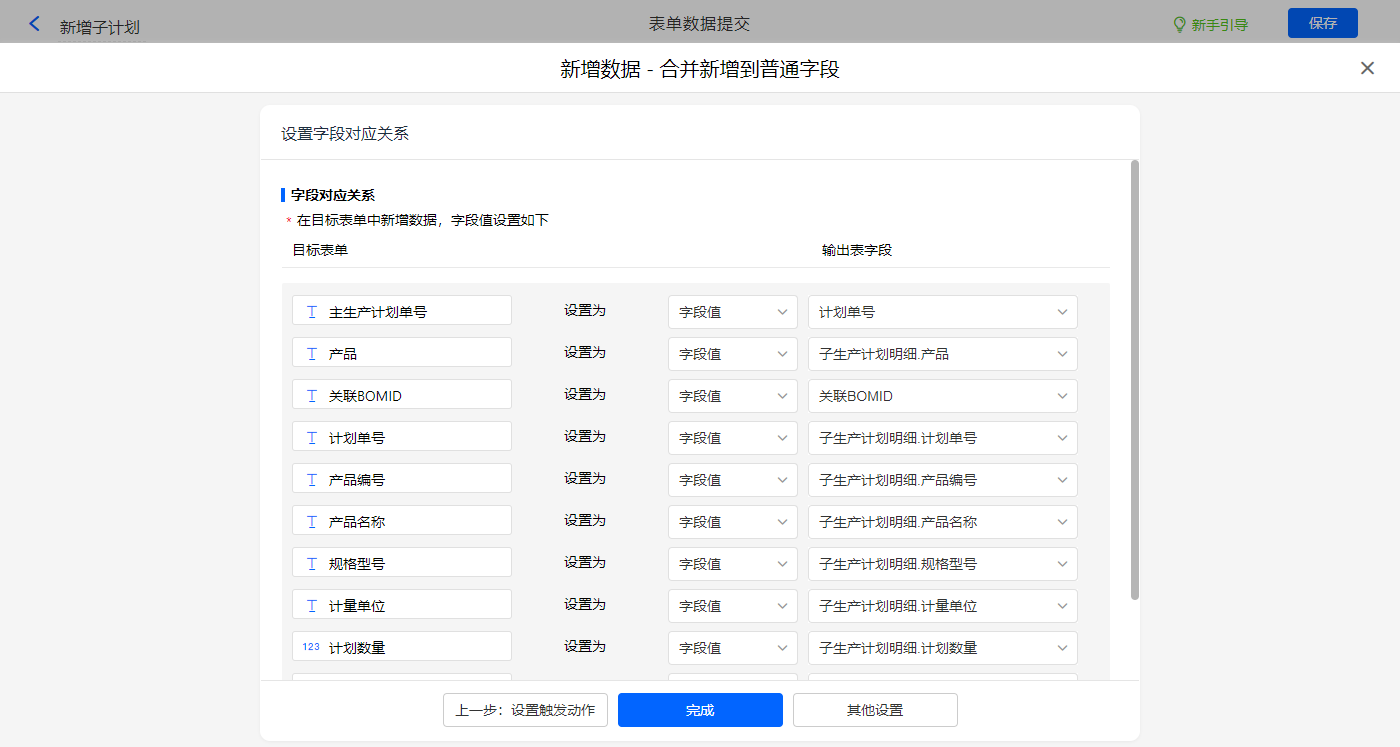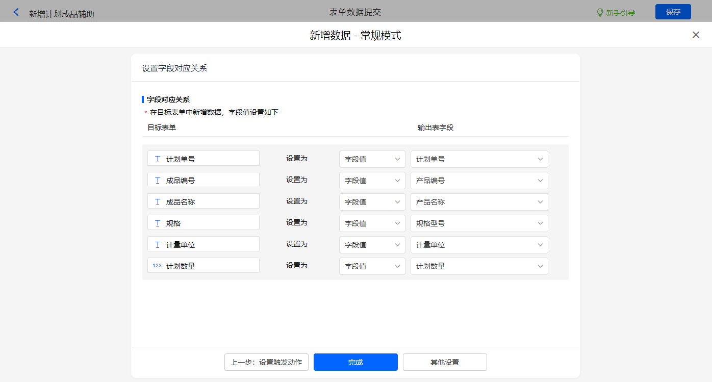 选择目标表单【计划成品辅助表】,设置对应赋值字段,设置好点击【完成】并保存该数据助手;